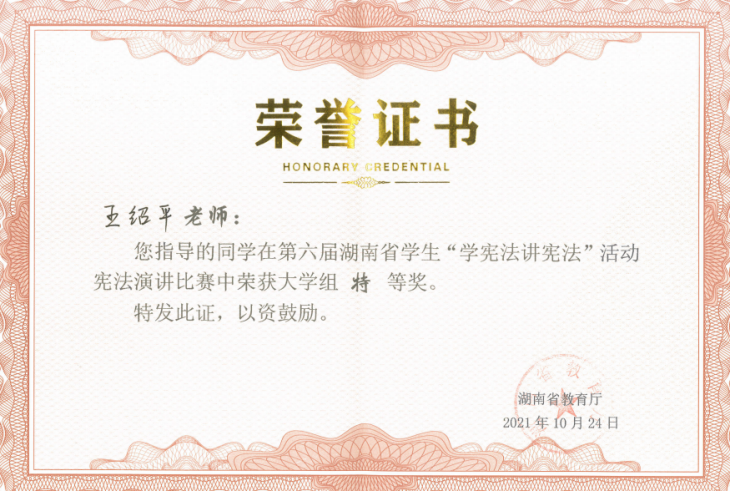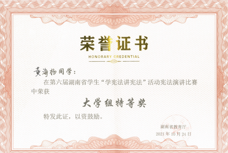 (记者 李翠霞)10月24日,由湖南省教育厅主办、湖南省法学研究基地和湘潭大学法学院联合承办的第六届全国学生“学宪法讲宪法”活动湖南赛区总决赛在湘潭大学举行。此次现场决赛分为高校组、高中组、初中组以及小学组进行,设演讲、法治知识竞赛两类赛事。我校法学院学生黄海杨荣获湖南赛区演讲比赛大学组唯一特等奖,并将代表湖南省大学生参加由教育部举办的全国总决赛。法学院学生王超荣获湖南赛区法治知识竞赛大学组一等奖。
