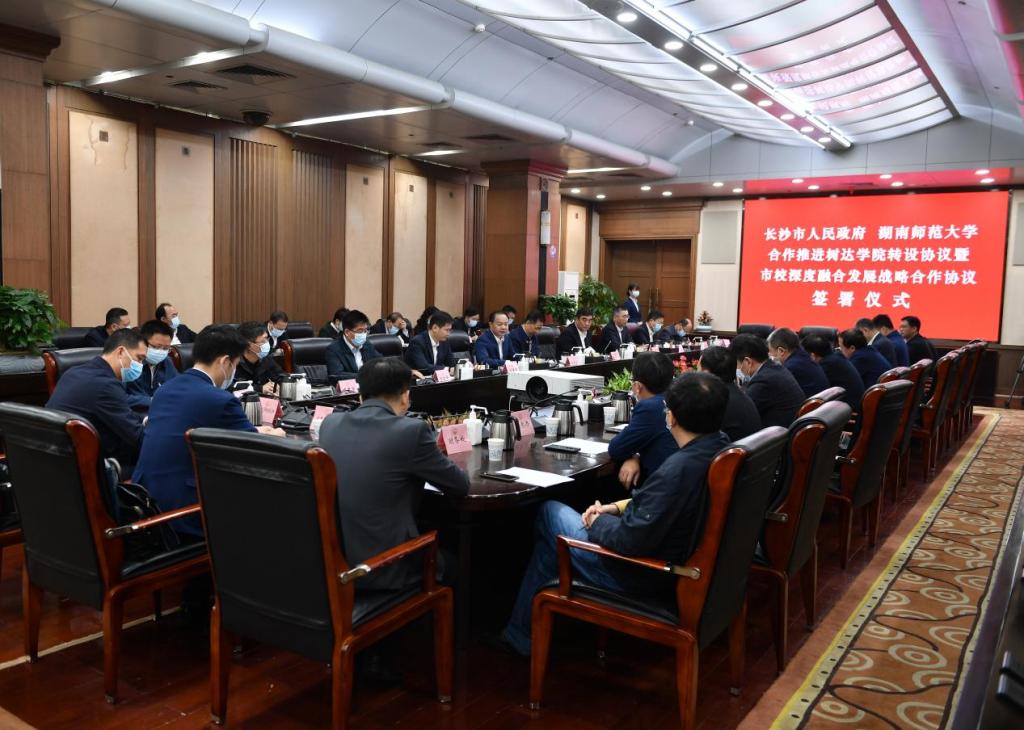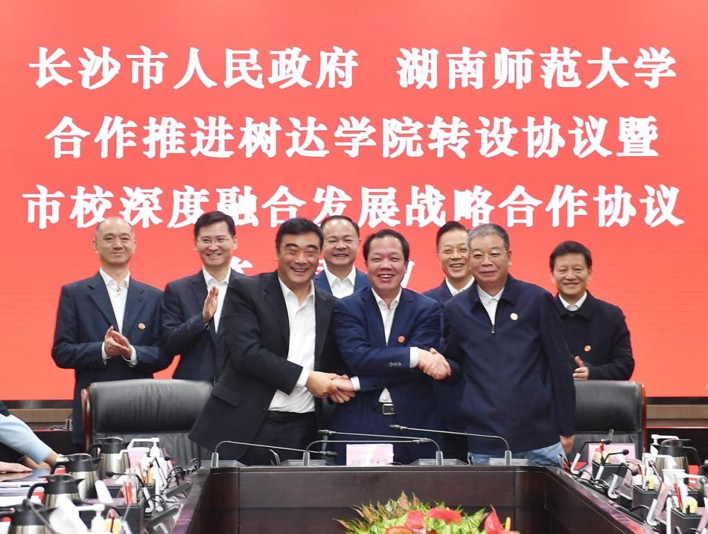 (记者 马铁泉)10月28日,我校与长沙市人民政府在市政府常务会议室举行合作推进树达学院转设协议暨市校深度融合发展战略合作协议签署仪式。长沙市委副书记、市长、湖南湘江新区党工委书记郑建新,省教育厅党组副书记、副厅长、教育工委副书记夏智伦,我校党委书记蒋洪新出席仪式并讲话,校长刘起军,校党委副书记、树达学院董事长周俊武代表学校和树达学院签署相关协议,副市长刘明理、我校副校长杨震参加签约仪式。仪式由长沙市委副书记、市委教育工作领导小组组长阚保勇主持。