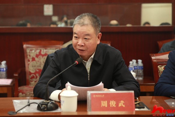 周俊武代表学校党委行政向大会的召开和新当选的校侨联新一届委员会班子成员表示祝贺,向省侨联长期以来对我校侨联的关心和厚爱表示感谢,向学校归侨侨眷致以亲切的问候。他就校侨联新一届委员会如何充分发挥好基层侨联组织作为联系广大归侨侨眷的桥梁纽带作用提出三点意见:一是凝聚共识,当好引路人,凝聚广大归侨侨眷思想共识,正确把握新形势下侨联工作发展方向,夯实侨界人士共同思想政治基础;二是强化服务,当好娘家人,主动解决好涉侨群众问题,着力提升为侨服务综合能力,当好广大归侨侨眷的代言人、贴心人。三是健全机制,当好先锋队,加强基层组织制度化、规范化、标准化建设,落实规范各项制度,努力提升校侨联组织力、服务力和创新力。