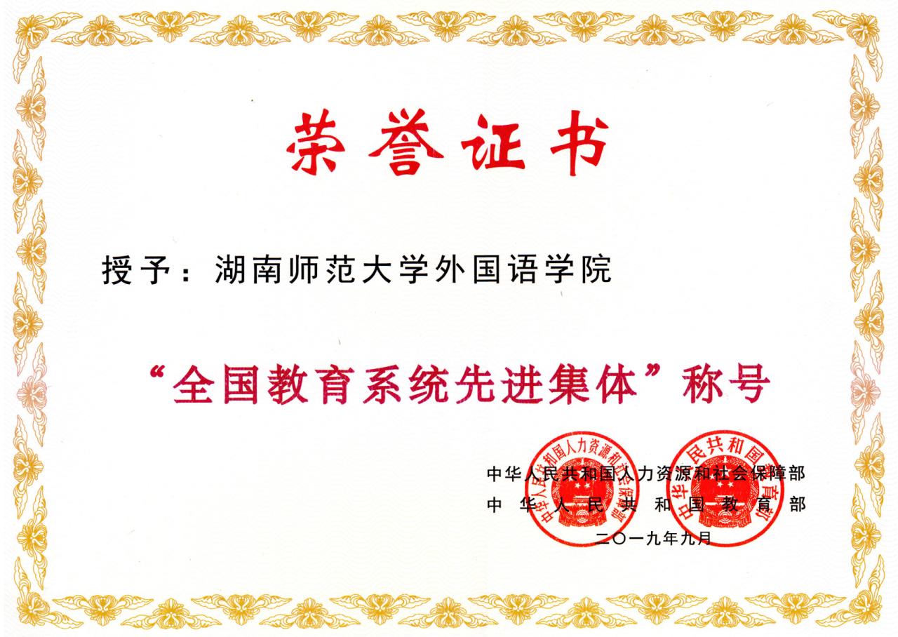 2019年9月,学院被人力资源和社会保障部、教育部授予“全国教育系统先进集体”荣誉称号,是2019年全国唯一获此殊荣的高校外国语学院。