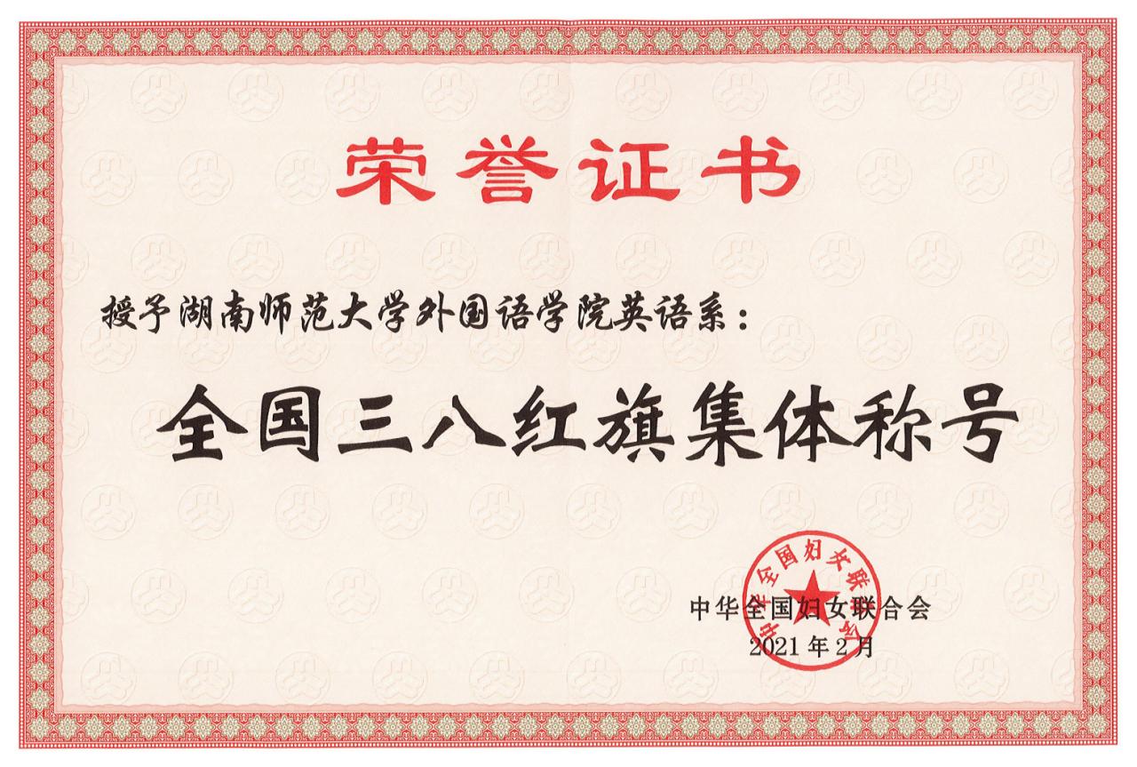 2021年2月,英语系被中华全国妇女联合会授予“全国三八红旗集体”荣誉称号。