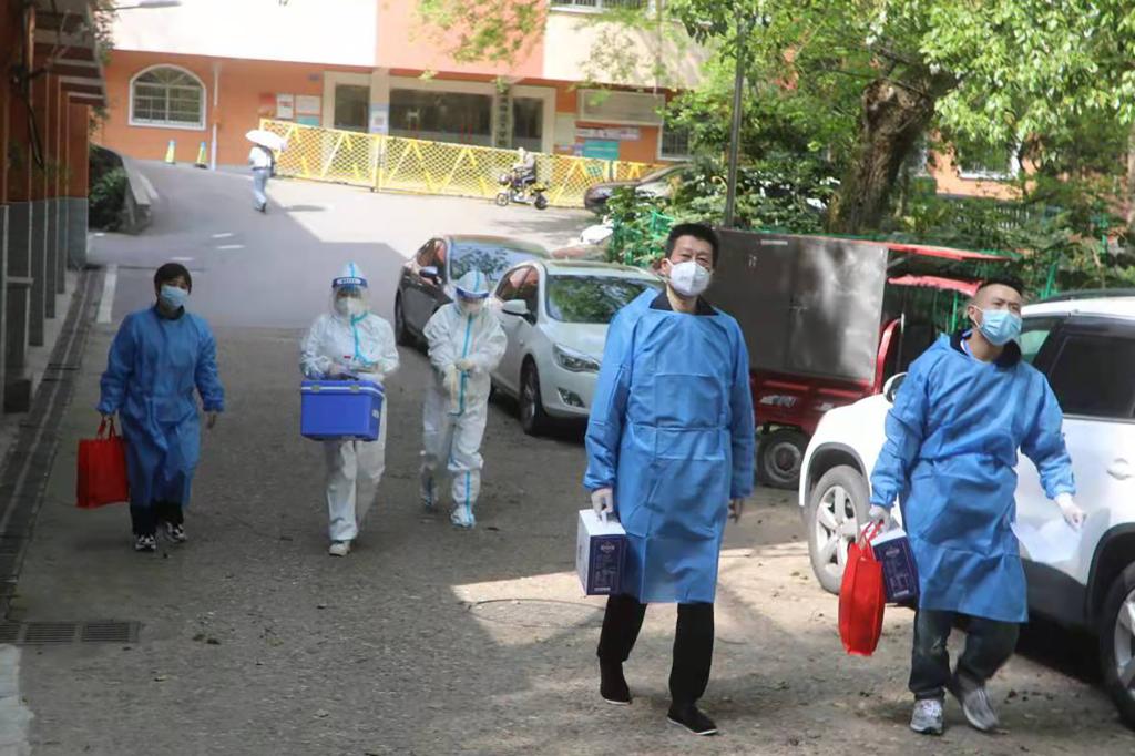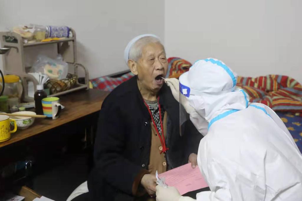 离退休工作处处长王齐、学校医管办党总支书记杨洁芳、张公岭校区离退休办工作人员与校医院医护人员一同前往管控区内五个片区的老同志家中进行核酸检测,高效高质地完成了“应检尽检”。