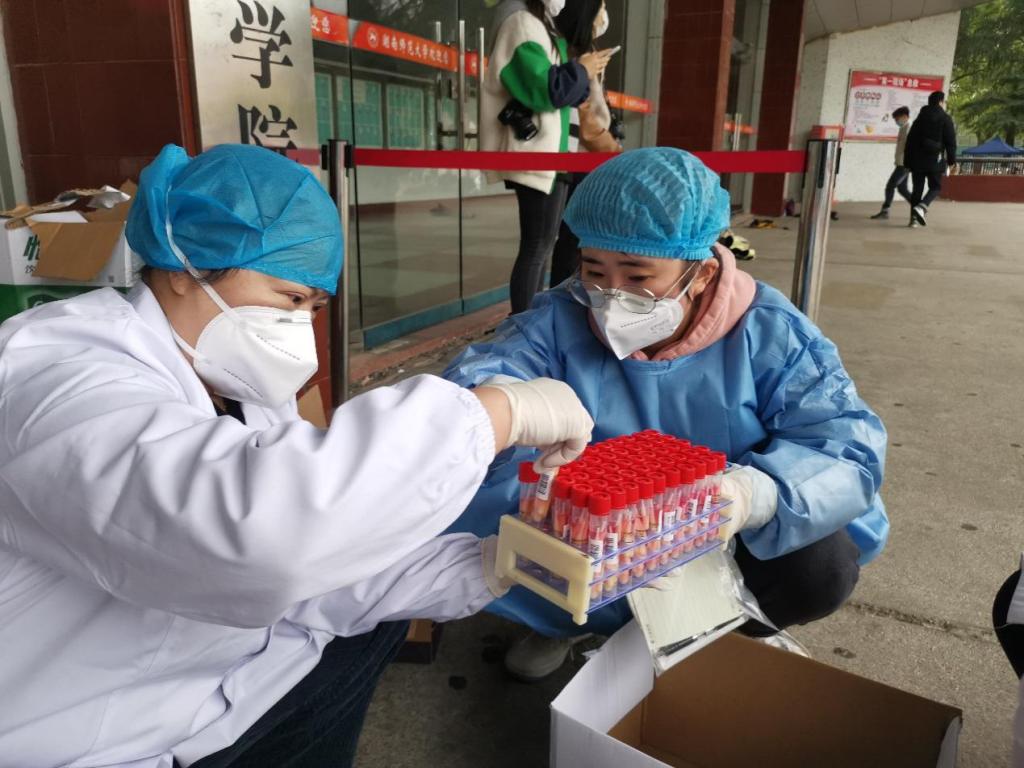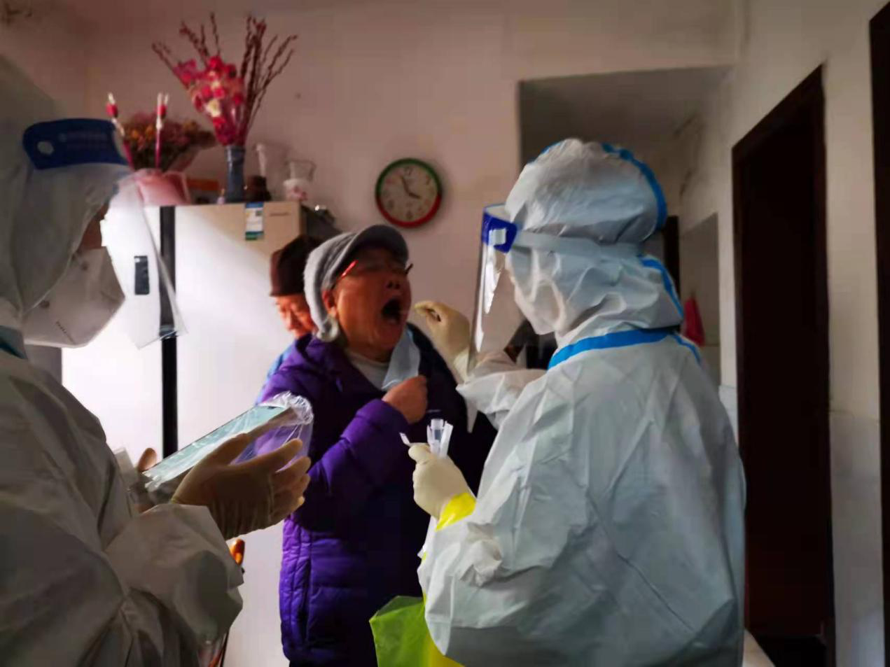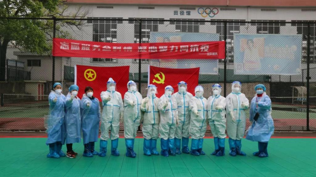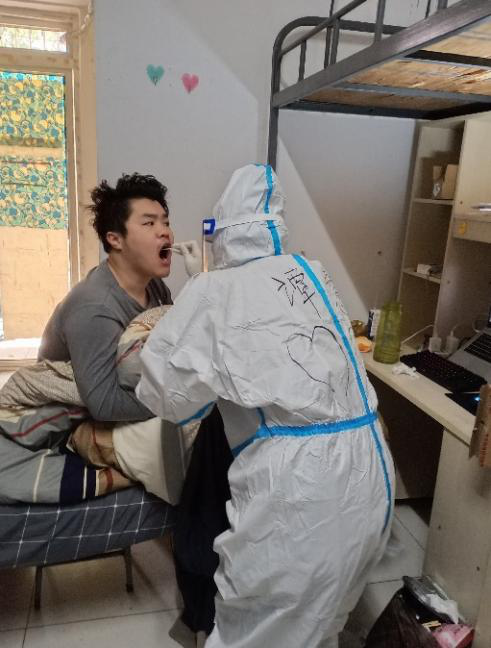 德智园宿舍区封控管理,90后年轻党员罗昊主动提出担任德智园宿舍区核酸检测工作负责人。他勇挑重担,冲锋在前。当得知德智园有不少黄码同学需要上门单独做核酸检测时,党员陈奕良同志主动请缨单独采集,每天穿着防护服上5楼,为同学们做核酸检测。罗昊和他的团队成员--党员凌青山、陈奕良、许婷等同志连续多日奋战在德智园,为近4000名学生做好核酸检测工作,并为每一位黄码学生认真做好上门服务工作;凌青山医生安置好瘫痪在床的父亲,主动留下担任驻园医生。60岁的老同志李辉光医生每天在核酸检测第一线坚持工作超过5个小时。