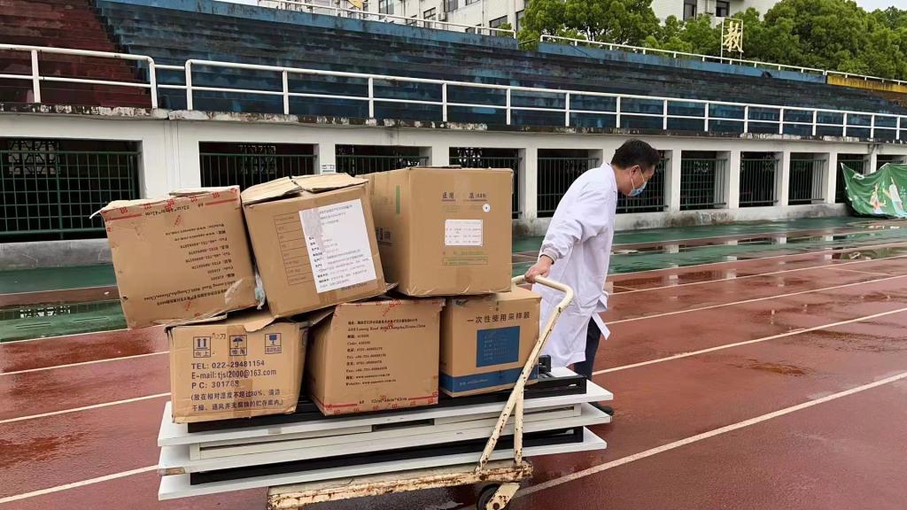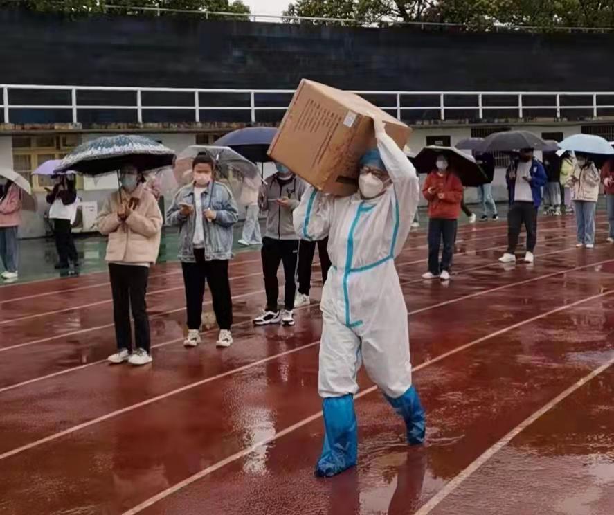 护士长张红伟负责田径场核酸检测工作,她带领的医护队伍担任医院预检分诊工作,为每位隔离师生准备了五个一——“一份盒饭、一瓶矿泉水、一盒纸巾、一包口罩、一瓶手消”。她的团队中,年轻的小护士李阳每天悉心指导志愿者老师穿脱防护服,党员何琳慧医生一人一组开展核酸检测。在倾盆大雨中,田径场的帐篷全部被吹倒,为防止大雨淋湿防疫物资,陈亚娟马上用自家车及时把物资转运到风雨长廊。