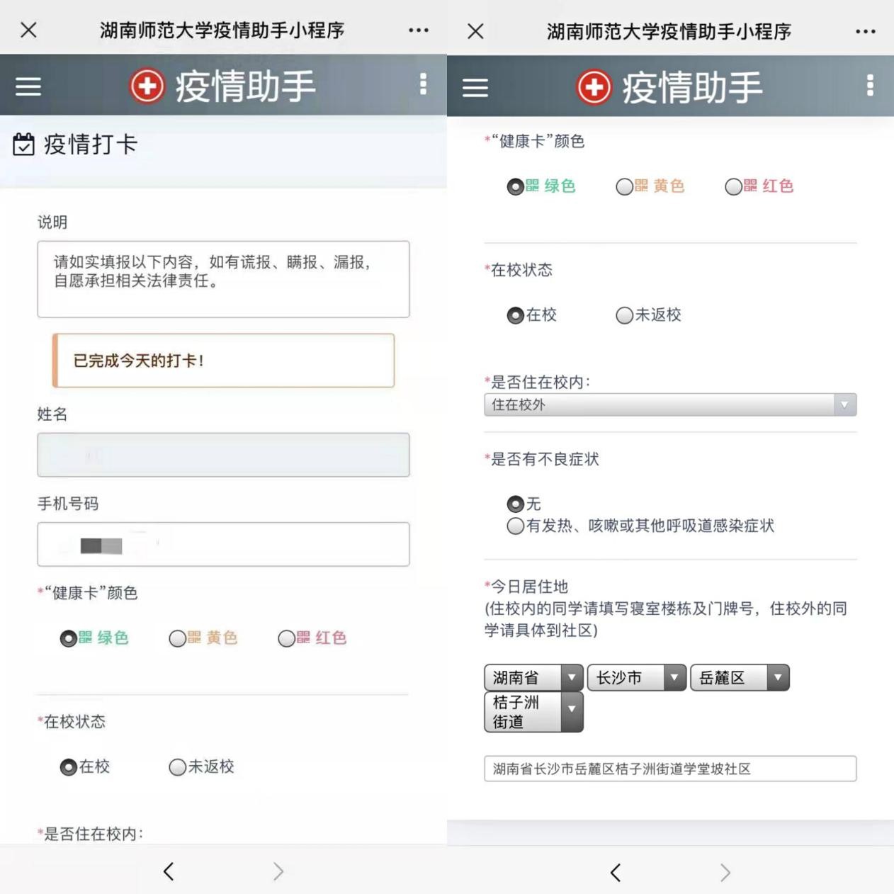 一区一策,不同区域分类管理将防控工作做实做细。3月26日起,二里半校区被划分为管控区,德智园宿舍区与湖大校区一起被管控,咸嘉湖校区实施封闭管理,3月29日起桃花坪宿舍区实施封闭管理。针对不同区域的不同情况,学校研工系统及时摸清底数,组建了不同区域的工作群,一区一策,在核酸检测、餐饮保障、学生就医等方面,实施分类管理服务。同时,在信息化办的支持下,启动了研究生“疫情助手”小程序,每天校内外9000多名研究生通过小程序完成健康打卡,一人一台账,将“日报告、零报告”制度落到实处。