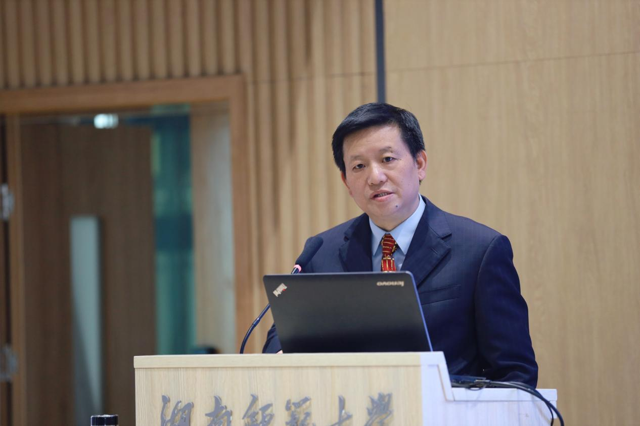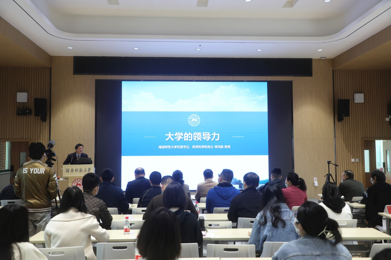 蒋洪新以中外知名大学的发展历程为例,从什么是大学的领导力、为什么谈大学的理想,如何实现大学的理想等三个方面进行了深入阐释。他认为,构成大学领导力有三个基本要素:一是大学的领导者;二是大学的被领导者;三是大学的组织、制度和文化。他指出,组织、文化和制度是大学的血脉,面对世界范围价值观较量的新态势,面对国内社会思想意识领域呈现的新变化,必须坚持社会主义办学方向,以高度的思想自觉和行动自觉,努力培育和践行社会主义核心价值观,培育崇德向善、务实有效、知行合一、有序和谐的大学文化,不断夯实大学师生共同的价值追求、行为准则、行为方式,切实增强大学文化的软实力,坚定中国特色社会主义文化自信,为建设一流大学提供强大动力。