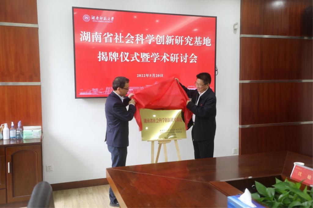戴树源、唐贤清共同为湖南省社会科学创新研究基地揭牌。