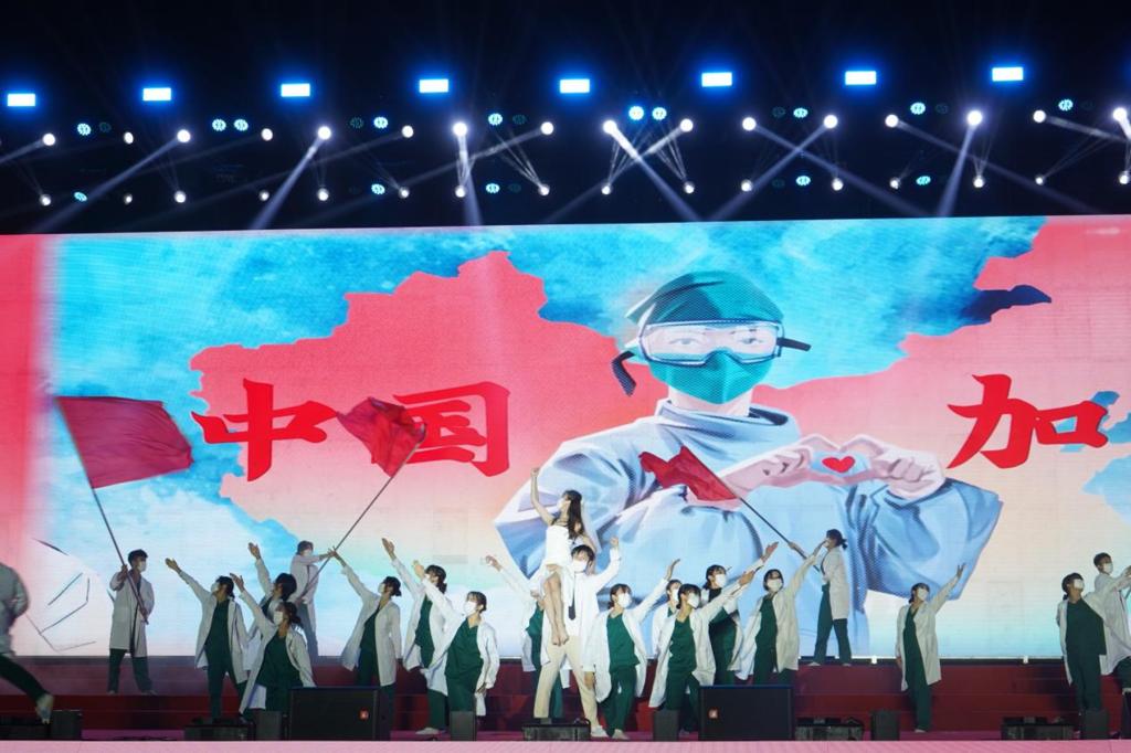 个人才艺展示环节,张溢堃用一曲《Raindrops Keep Falling On My Head》,诠释了师大学子的坚韧与热情;李汝勤在金色麦浪中带来歌曲《稻香》,展现师大人珍惜当下,砥砺前行的姿态;刘吉胜、邓郭欢献上原创舞台剧《何辞西去》,彰显一代教育者育人育才育魂的大无我精神与铮铮风骨;王旭和黄嘉仪联袂出演歌舞《青春印象》,舞姿灵动,尽显青春本色;刘乔、王亚洁带来原创诗歌朗诵《生命的名义》,歌颂医者奉献精神,感情真挚、声声入耳、震撼人心;黄儒昊、李羽鑫携手,以舞蹈《“疫”路有你》致敬抗疫路上英勇逆行的每一个“你”……晚会呈现了众多节目,精彩纷呈、青春洋溢,为现场观众带来了一场场视觉盛宴。20位选手返场齐舞,带动全场共同呐喊师大之星口号“更努力,更青春”,将全场气氛推向顶峰。
