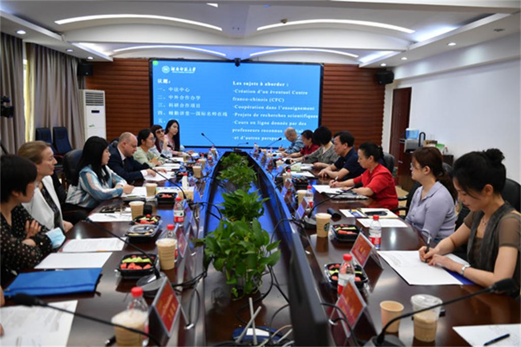 费奕先生一行参观了我校省部共建淡水鱼类发育生物学国家重点实验室,在木兰楼会议室与国际处、科技处、研究生院、外国语学院,和生命科学学院相关人员就中法中心、中外合作办学、科研合作项目、“精勤讲堂-国际名师在线”等项目展开会谈。