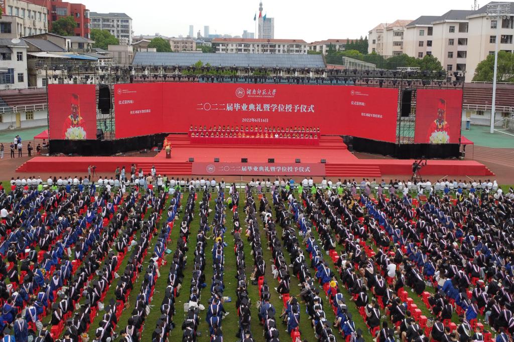 音乐学院硕士研究生赵玥、物理与电子科学学院本科生郭畅作为毕业生代表发言。他们回忆了自己在校求学和成长的经历,表达了对母校、对老师的感激与不舍之情以及争做栋梁、报效祖国的决心。