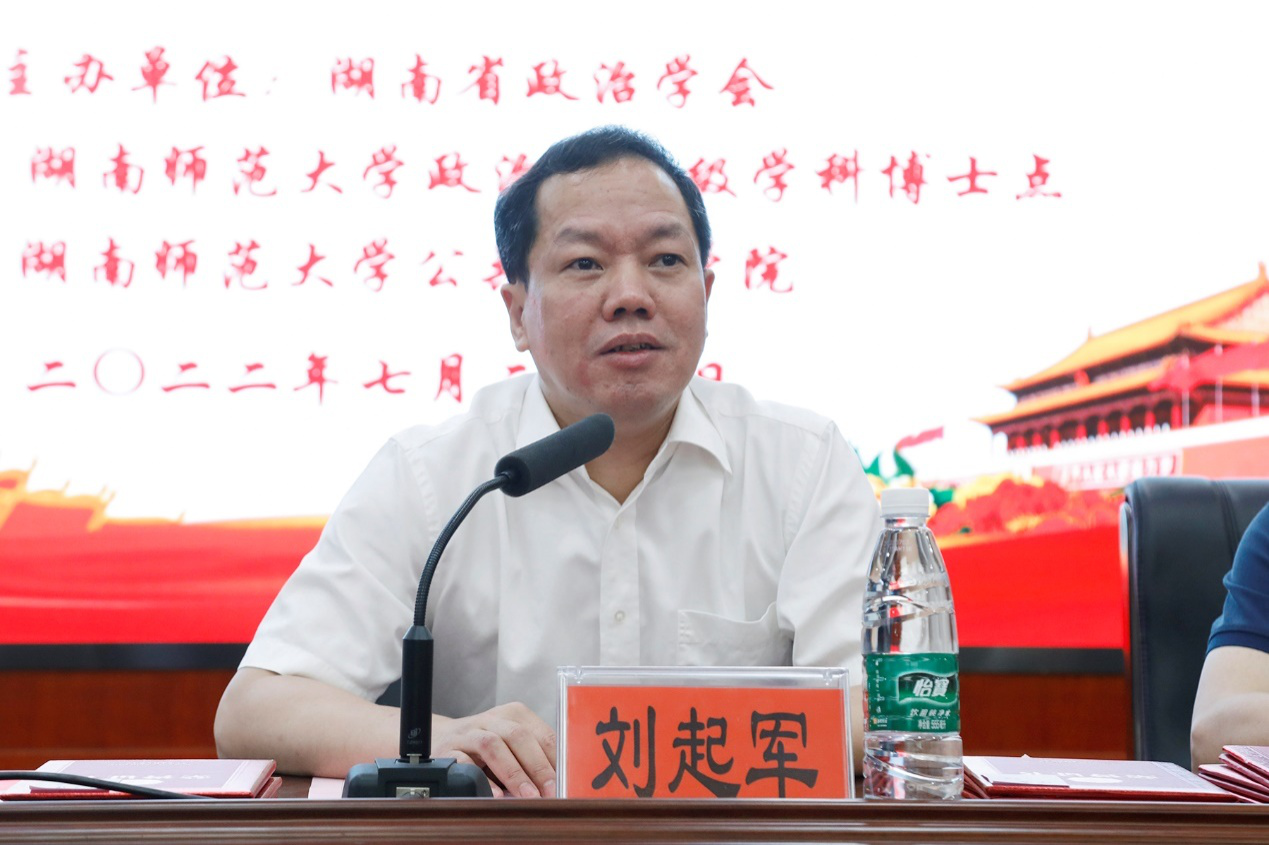 刘起军回顾了我校政治学学科与湖南省政治学会的紧密联系,对湖南省政治学界各位领导及学者对我校政治学科的关怀和支持表示感谢。他强调,当今世界正经历百年未有之大变局,有许多重大理论问题亟需我们去研究,研究政治学大有可为。当下政治学研究要立足实现中华民族伟大复兴,认真汲取历史文化智慧,积极凝炼中国特色的政治学经验,以高质量原创性研究成果,构建中国特色、中国风格、中国气派的政治学,为实现“两个一百年”奋斗目标做出贡献。