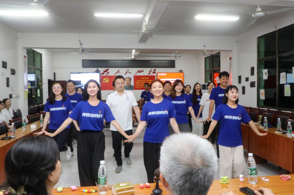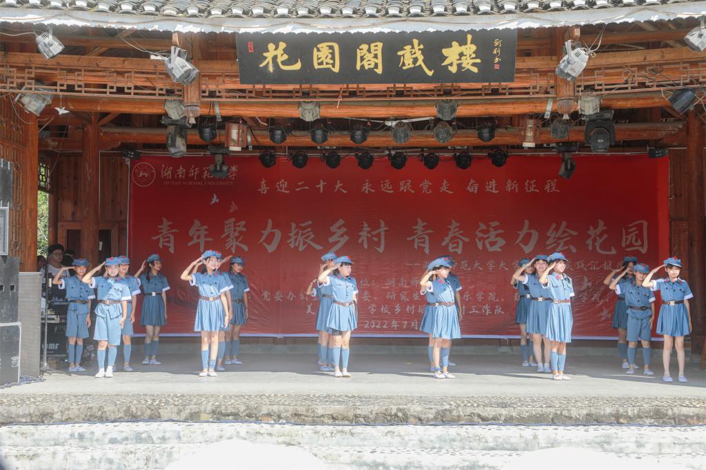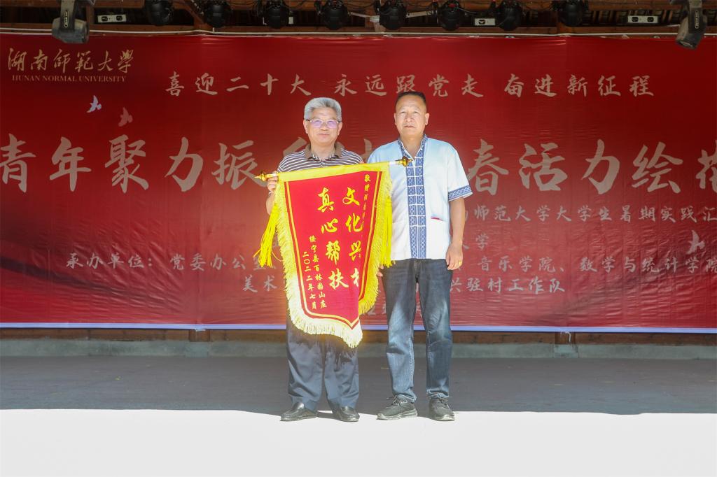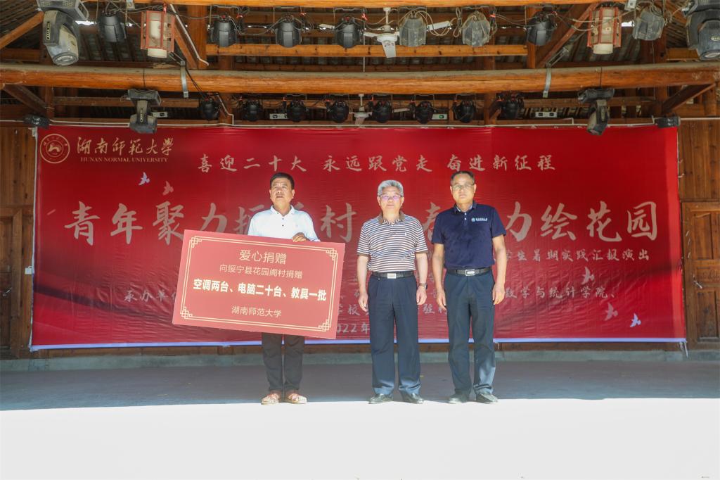 唐贤清一行还观看了由我校各暑期实践团师生、花园阁村民和孩子们共同举办的以“青年聚力振乡村,青春活力绘花园”为主题的文艺汇报演出,并对参与社会实践和大学生暑期实践汇报演出的师生进行了慰问。唐贤清代表学校向绥宁县花园阁村捐赠物资,并接受花园阁村敬献的锦旗。