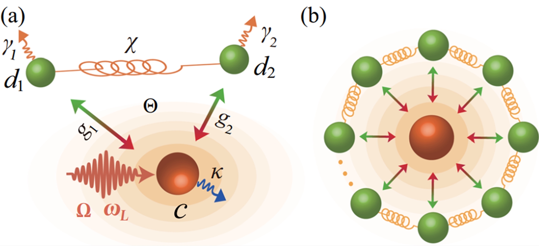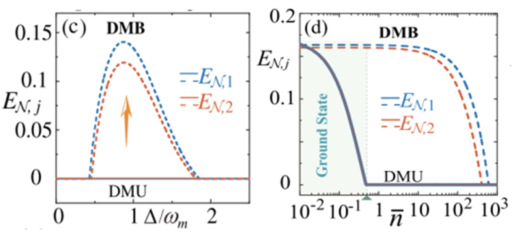 图:(a)单个光学模式耦合两个力学模式的物理模型示意图。(b)单个光学模式耦合多个力学模式的物理模型示意图。(c,d)当存在暗模(DMU)和打破暗模(DMB)时,光力纠缠度量随着(c)腔场失谐和(d)热声子数的变化。