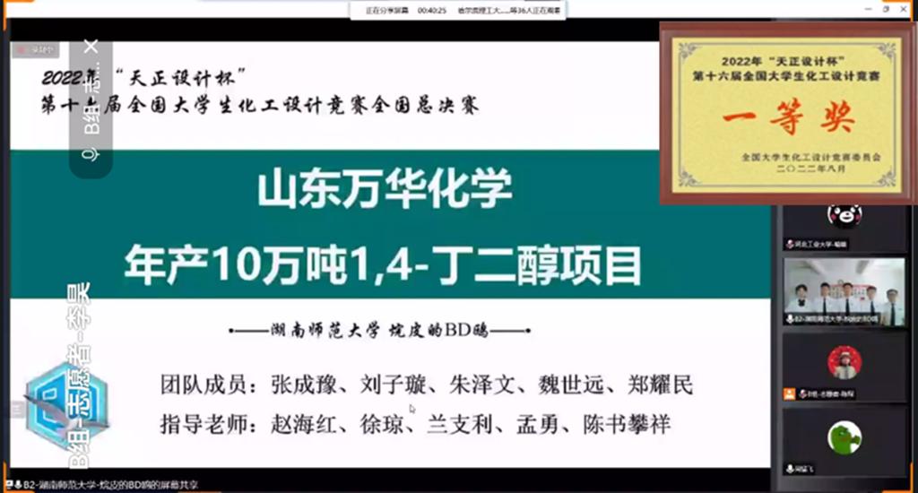 (供稿 化学化工学院)8月21日至22日,由中国化工学会、中国化工教育协会主办,华东理工大学承办的2022年“天正设计杯”第十六届全国大学生化工设计竞赛全国总决赛以线上形式举行。化学化工学院2019级本科生参赛队斩获全国一等奖。