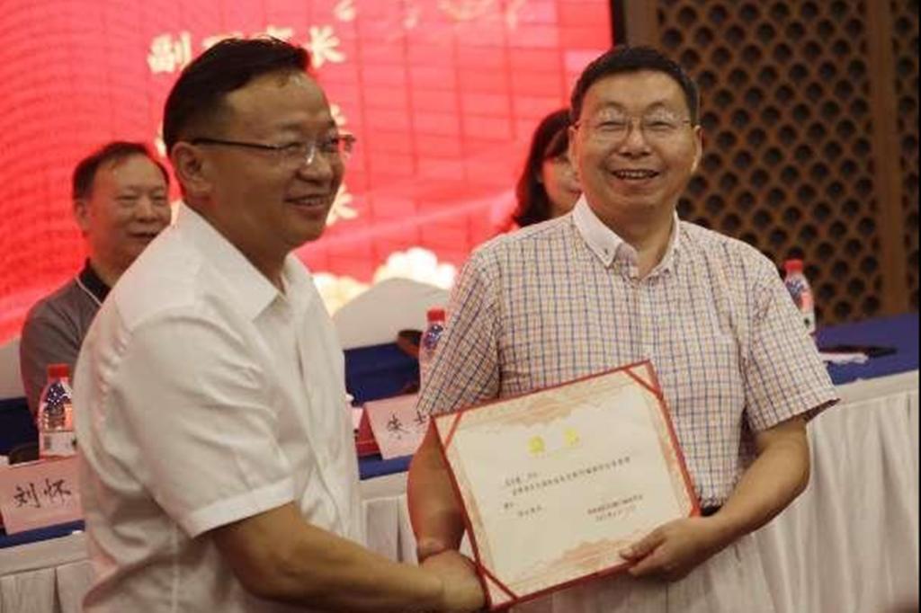 刘怀德为前一届学会理事长匡乐满颁发荣誉理事长证书。