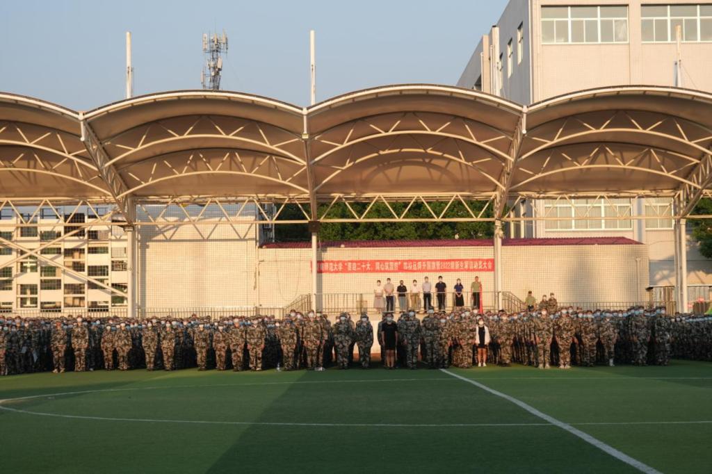 2022级新生军训动员大会在庄严的国歌声中拉开帷幕。四个校区的女子国旗护卫队队员们同时护送国旗走向升旗台,全场师生一同高唱国歌,共同注目五星红旗冉冉升起。