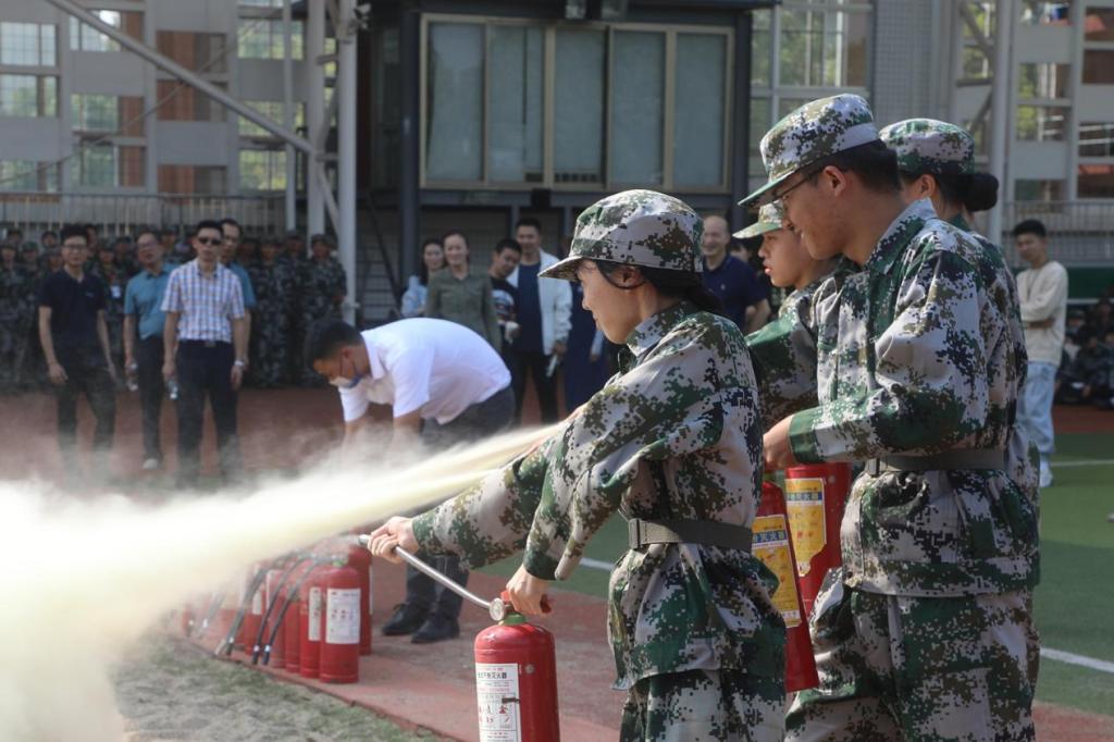 新生代表在教官的指导下,使用灭火器进行实操,并分组依次进入烟道进行模拟逃生活动。