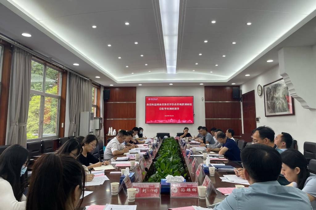 (供稿 发展规划与学科建设处)近日,省教育厅湖南省教育评价改革现状调研组来校专题调研。省委教育工作领导小组秘书组秘书处处长崔恒源、调研组总负责人余小波教授、我校副校长杨震出席调研会。调研会由调研组三组组长刘声涛副教授主持。