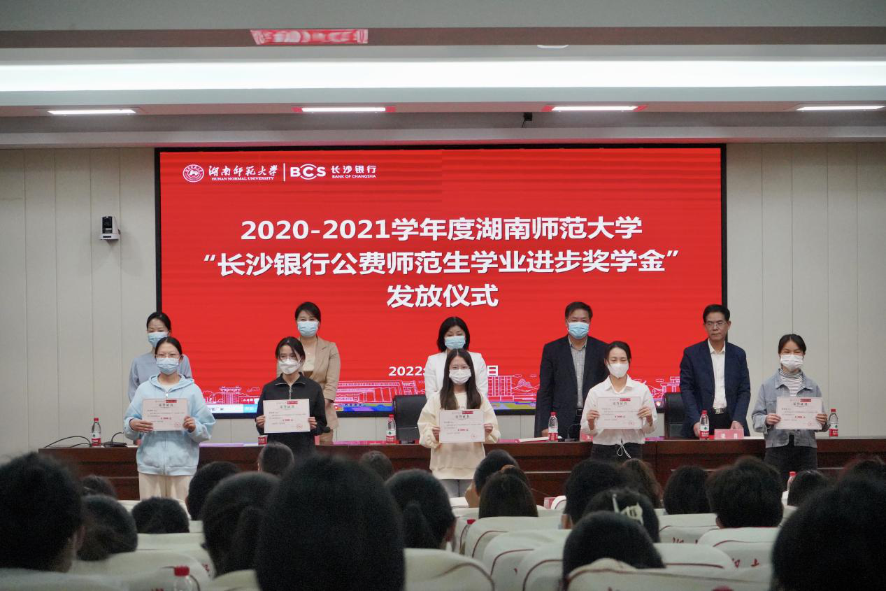 (通讯员 高远瞩 胡典奕 何伊婷 曾靖雯 杨予曦)10月18日下午,我校2020-2021学年度“长沙银行公费师范生学业进步奖学金”颁发仪式于中和楼中和讲堂举行。长沙银行股份有限公司党委委员、副行长张曼,我校副校长王辉出席仪式。仪式由学生工作部部长向发意主持。