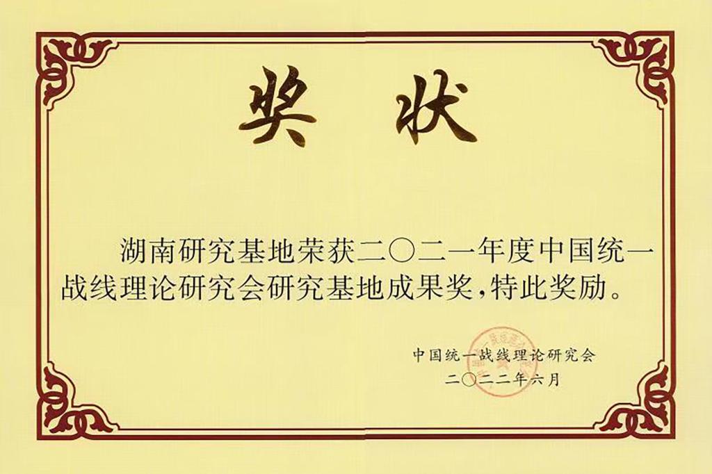 (供稿 党委统战部)近日,中共湖南省委统战部向我校发来贺信,祝贺我校党外代表人士统战工作理论湖南研究基地在2021年度中国统一战线理论研究会研究基地量化考核中以总分121.6夺得全国第二名、研究成果第二名的好成绩,获得中国统一战线理论研究会颁发的“流动奖杯”和“研究成果奖”,这是我校基地继2020年度考核首次进入前三后再创佳绩,也是基地成立以来在中国统一战线理论研究会基地考核中取得的最好成绩。