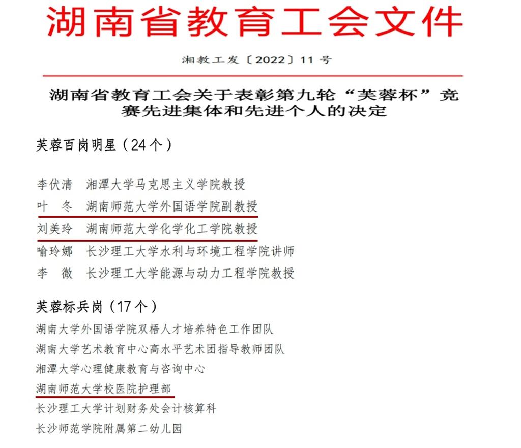 (供稿 校工会)近日,湖南省第九轮女职工“芙蓉杯”竞赛圆满收官,我校工会在此轮竞赛中荣获多项殊荣,获奖数位居全省高校前列。其中,医学院临床医学系获评湖南省总工会“湖南省芙蓉标兵岗”(全省教育系统仅4家);校医院护理部获评湖南省教育工会“芙蓉标兵岗”,化学化工学院刘美玲教授、外国语学院叶冬副教授获评湖南省教育工会“芙蓉百岗明星”。