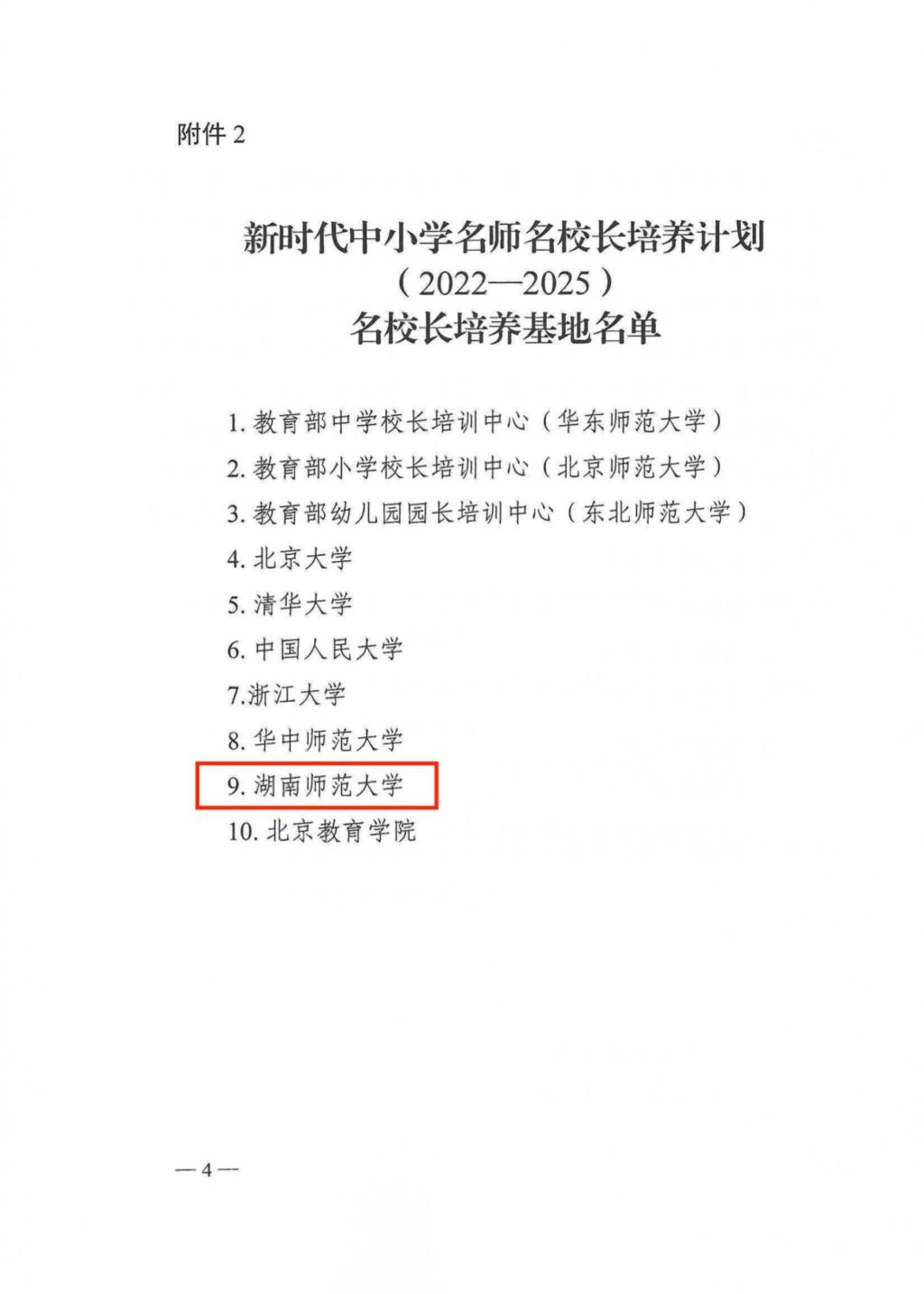 (通讯员 陈甲元)近日,教育部下发《教育部办公厅关于公布新时代中小学名师名校长培养计划(2022—2025)培养基地及培养对象名单的通知》(教师厅函〔2022〕32号),我校成功入选教育部新时代中小学名师名校长培养计划(2022—2025)名校长培养基地,成为全国十个名校长培养基地之一,这是继我校入选“教育部—中国移动中西部中小学校长培训项目”20所承办高校之列后的又一重大成果,该项目也是目前教育部中小学校长培训中层次最高的项目。
