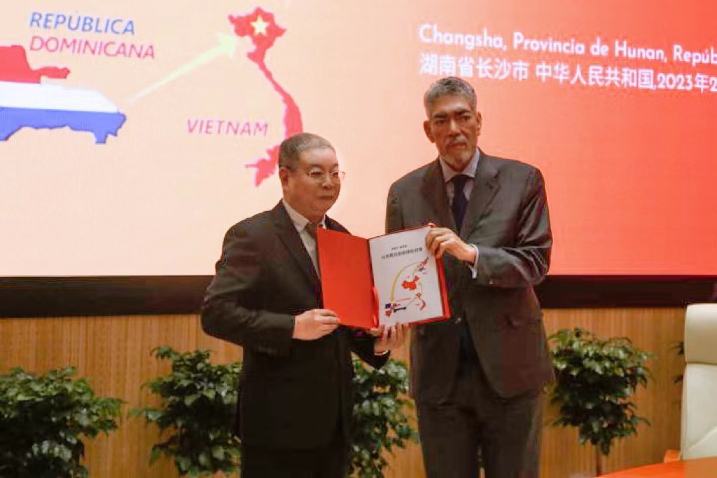 米格尔·梅希亚对我校的热情接待表示感谢。他提到,中多建交以来双方合作成果斐然。在“一带一路”推动下,双方实现协同发展,并肯定了湖南省在其中发挥的重要作用。他还感谢了中国政府对多米尼加的帮助,尤其是在新冠疫情期间向多米尼加无偿捐赠疫苗的国际人道主义援助。