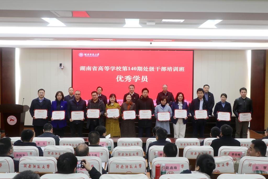 (记者 马铁泉 冯振辉)3月24日下午,由省委教育工委党校与我校联合举办的湖南省高等学校第140期处级干部培训班结业典礼在中和讲堂举行。省委教育工委副书记、省教育厅党组成员、一级巡视员王建华,省委教育工委党校常务副校长、省高校干部培训中心书记、主任刘国华,我校党委副书记周俊武出席典礼。典礼由我校党委委员、党委组织部部长沈又红主持。