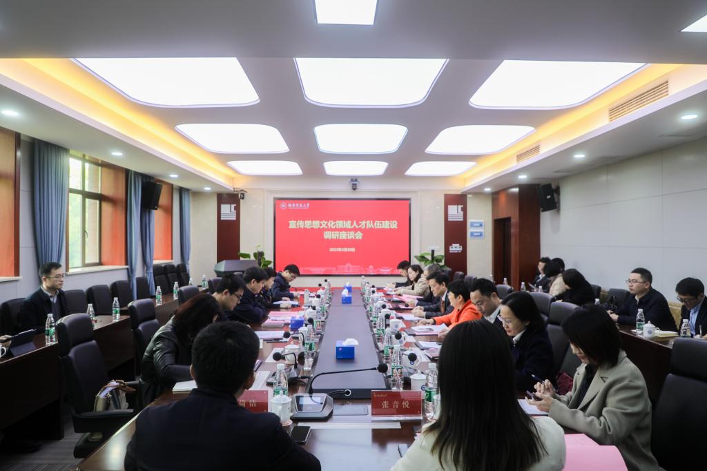 (记者 马铁泉 冯振辉)3月30日,宣传思想文化领域人才队伍建设调研座谈会在我校中和楼召开,中央宣传部干部局副局长张继青,湖南省委宣传部一级巡视员李颖,我校党委书记蒋洪新、党委副书记周俊武出席座谈会,会议由李颖主持。