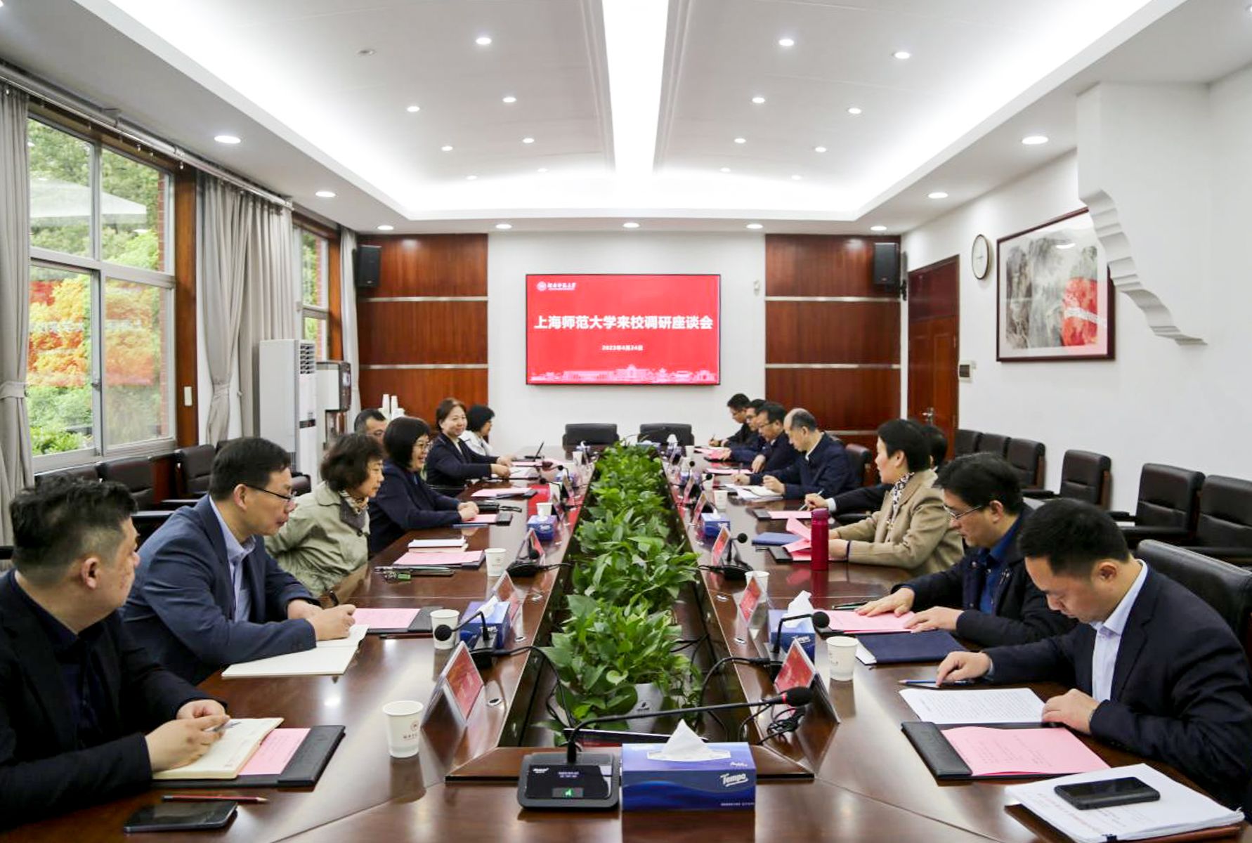 (记者 马铁泉 马境韩)4月24日上午,上海师范大学党委书记林在勇、校长袁雯、副校长陈恒一行来我校调研交流。我校党委书记蒋洪新,副校长杨震、谢资清热情接待了客人。