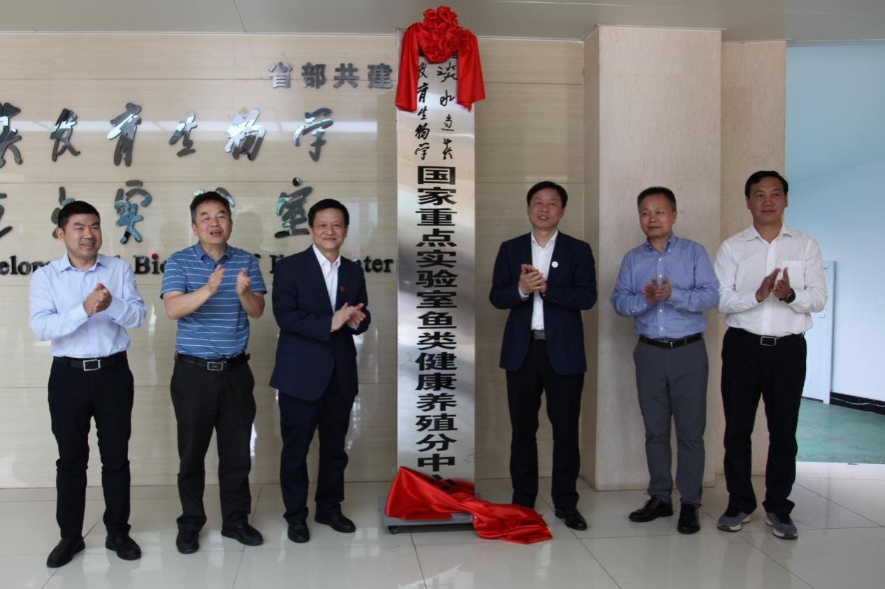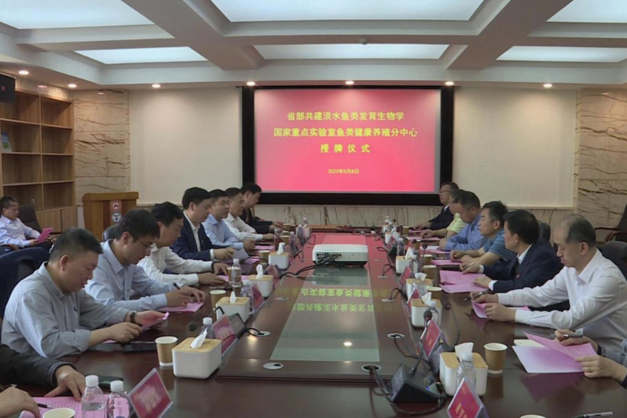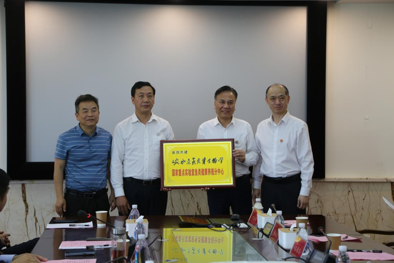 刘少军、杨震为省部共建淡水鱼类发育生物学国家重点实验室鱼类健康养殖分中心授牌,刘宇文和李红革接牌。
