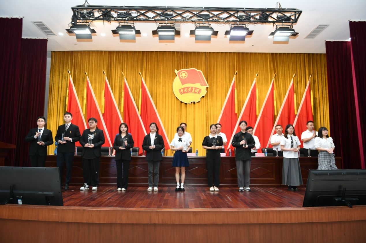 主席台就座嘉宾分别为获奖先进团体及优秀个人颁奖。“十佳共青团先进工作者”历史文化学院团委书记陈卓君、“芙蓉学子社会实践奖”旅游学院“云聚童心·乡绘曦望”志愿服务团队作代表发言。
