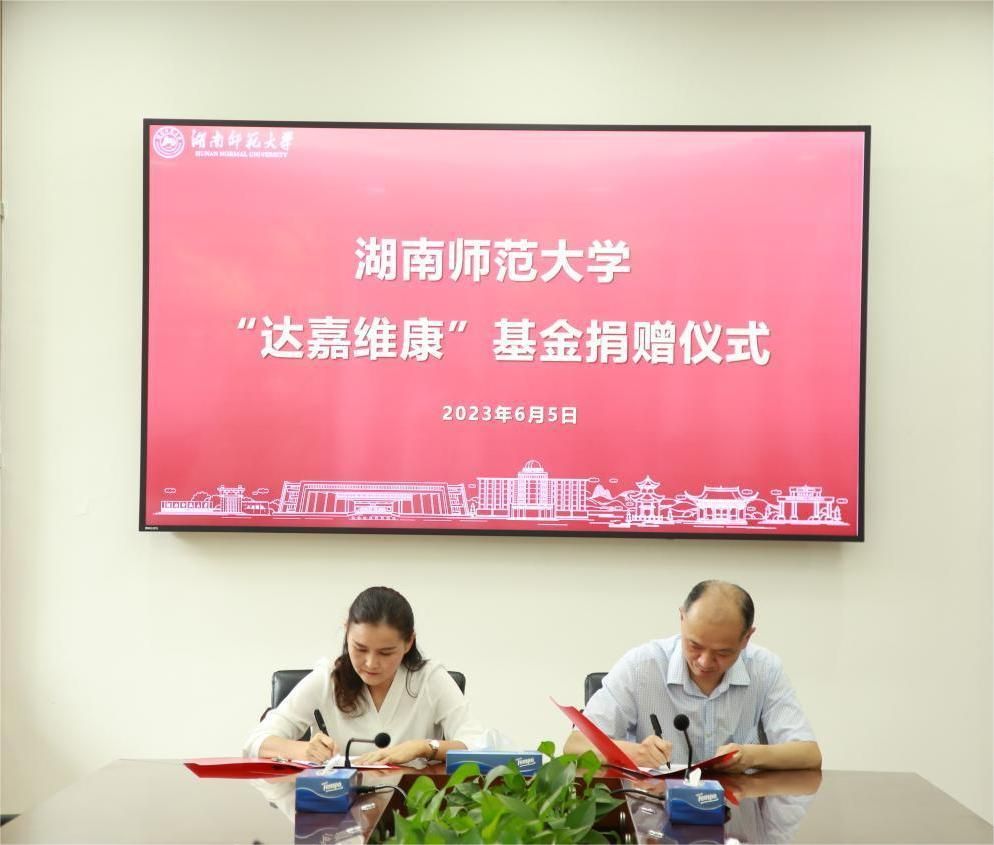 (通讯员 唐健清 谭恒)6月5日下午,我校与湖南达嘉维康医药集团举行基金捐赠项目签约仪式。湖南达嘉维康医药集团总裁胡胜利,我校副校长杨震出席签约仪式。签约仪式由化学化工学院党委书记谭东波主持。