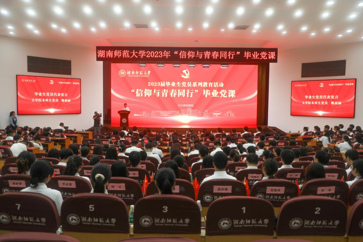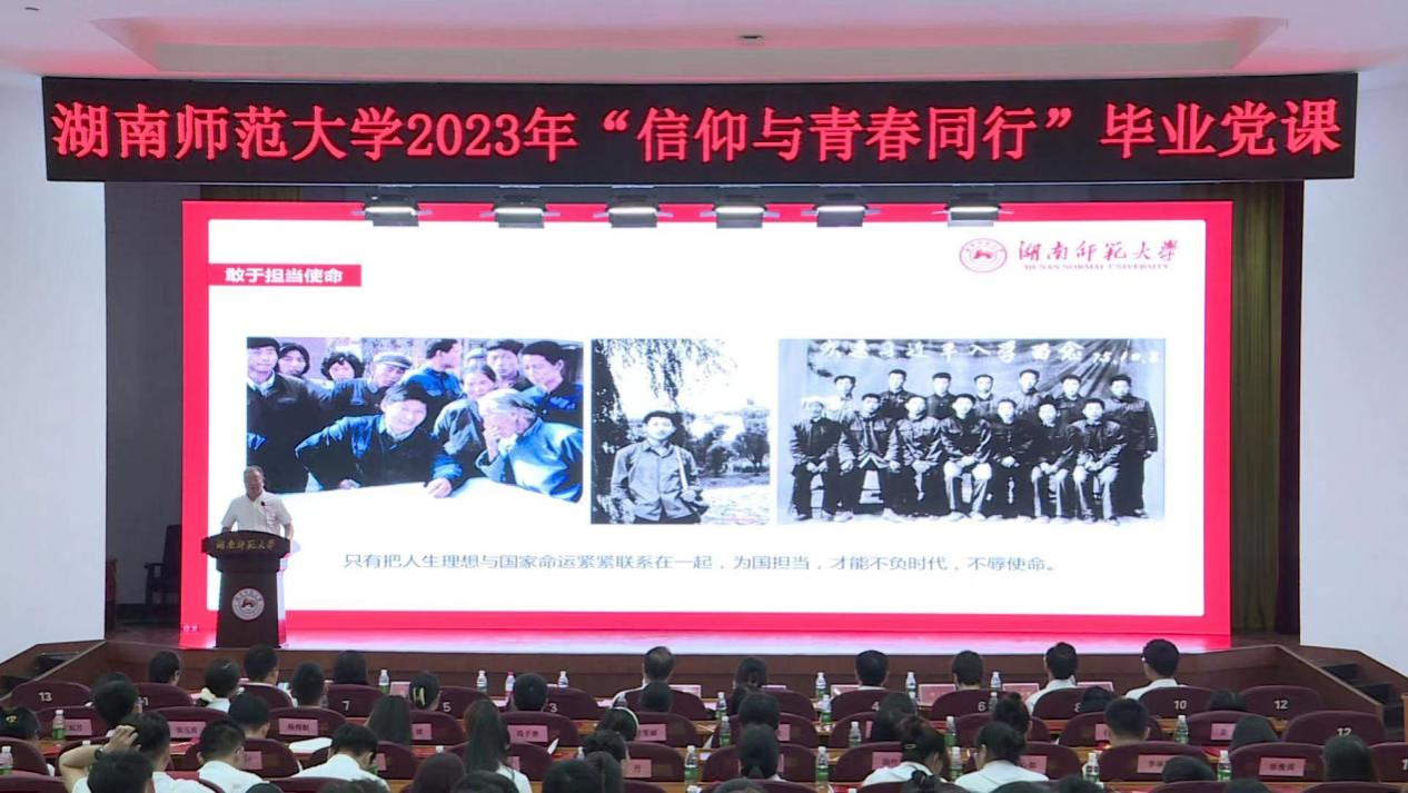 周俊武为毕业生党员讲授了《牢记嘱托,带头做新时代好青年》的主题党课。他与毕业生党员一同深情回顾了与师大的奇妙缘分和难忘时刻,并从“当代中国青年所处的历史方位是什么”“如何带头做有理想、敢担当、能吃苦、肯奋斗的新时代好青年”两个问题入手,阐释“正青春”的青年党员在新时代的责任与担当。他引用习近平总书记在党的二十大报告中关于青年的寄语,“青年强,则国家强。当代中国青年生逢其时,施展才干的舞台无比广阔,实现梦想的前景无比光明”,勉励青年党员在青春的赛道上,要坚定理想信念,深刻感悟湖湘红色精神,坚守入党初心,用马克思主义信仰引领人生理想;要敢于担当使命,以时代赋予青年的历史使命为己任,将人生理想与国家命运紧密联系,迎难而上,彰显担当精神;要涵养吃苦精神,在吃苦中锤炼意志、强壮筋骨,历练能力、提高本领,把论文写在祖国大地上、写在乡村振兴一线、写在教书育人的讲台上;要坚持不懈奋斗,秉承湖南师大人砥砺奋斗的光荣传统,在推进中国式现代化中贡献智慧与力量,让青春在全面建设社会主义现代化国家的火热实践中绽放绚丽之花。他希望各位毕业生党员时刻牢记党和人民的嘱托,牢记母校的期盼,牢记自己的身份,以青年党员的精气神,怀抱梦想又脚踏实地,敢想敢为又善作善成。有底气,争做政治上的明白人;有朝气,争做实践中的赶路人;有志气,争做时代中的弄潮人。他祝福全体毕业生同学一帆风顺,前程似锦,再创辉煌。
