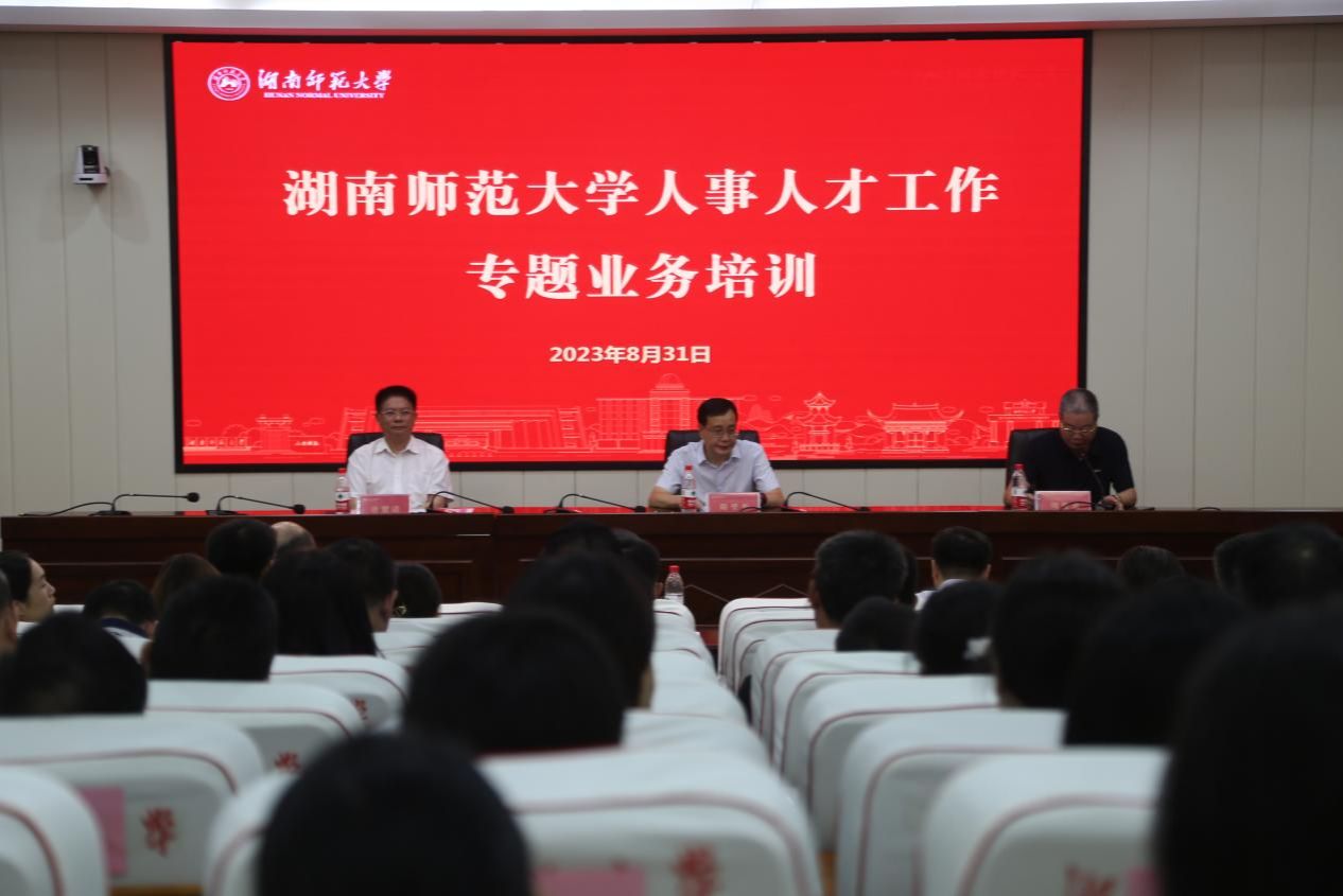(供稿 人事处)8月31日,我校举办人事人才工作专题业务培训。湖南省人力资源和社会保障厅党组成员、副厅长阳望平,副校长唐贤清出席开班仪式。仪式由我校党委副书记周俊武主持。