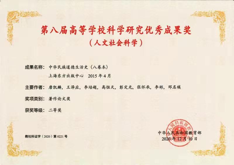 唐凯麟、王泽应、张怀承等教授共同完成的丛书《中华民族道德生活史》(8卷本)是我国伦理学界填补空白之作。丛书追溯和探究了中华民族道德生活史的演进和变迁,将中华民族向善、求善、行善的光荣历史进行了宏观、综合、系统的叙述,开创了我国伦理学研究的新方向。该丛书获第十四届湖南省社会科学优秀成果一等奖和第八届高等学校科研研究优秀成果(人文社会科学)二等奖。