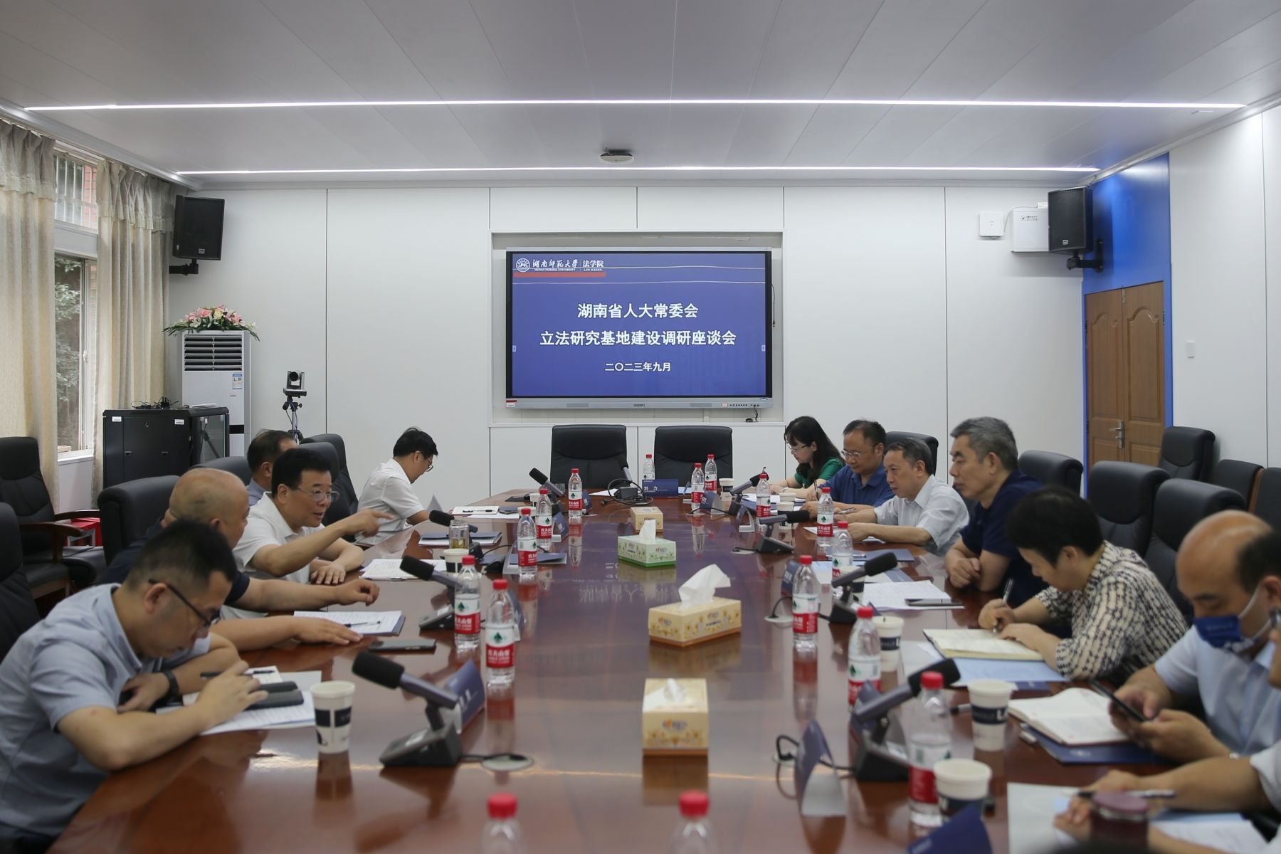 会前,陈飞一行调研了我校校史馆、博物馆、法学院立法研究基地,听取了相关负责人的汇报。陈飞、蒋洪新共同为湖南省第十四届人大常委会立法研究基地揭牌。