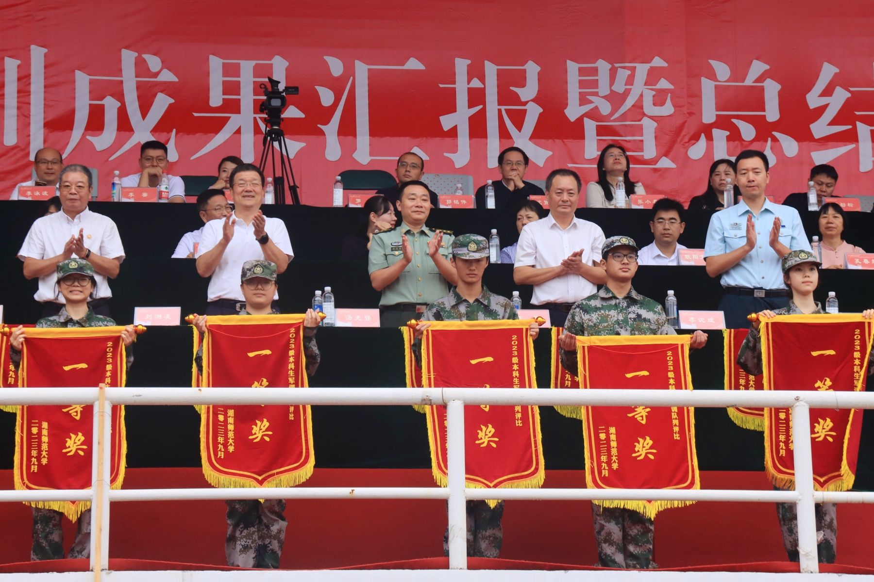 (记者 李琳 项和烽 何顺福)9月28日上午,我校2023级本科新生军训成果汇报暨总结表彰大会在二里半校区田径场举行,来自22个学院的同学们身着军装,神采奕奕,接受检阅。省总工会党组成员、省教育工会主席刘湘凌,省教育工会普教部副部长龙培,校党委副书记周俊武,副校长王辉,省军区、岳麓区人民武装部领导,学校各职能部门负责人,校军训工作领导小组成员及各学院负责人一同检阅了2023级本科新生军训成果。大会由学生工作部、武装部部长向发意主持。