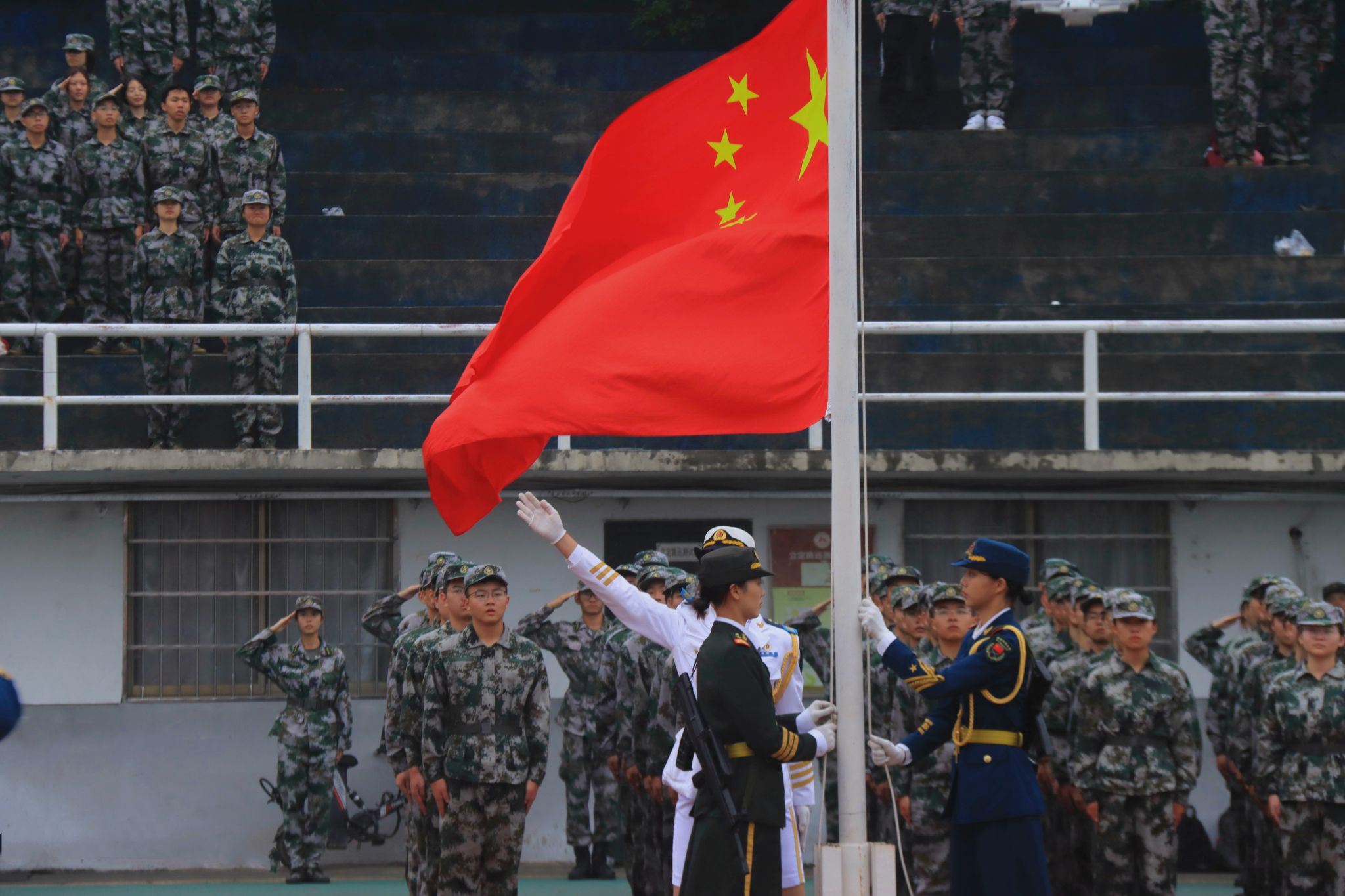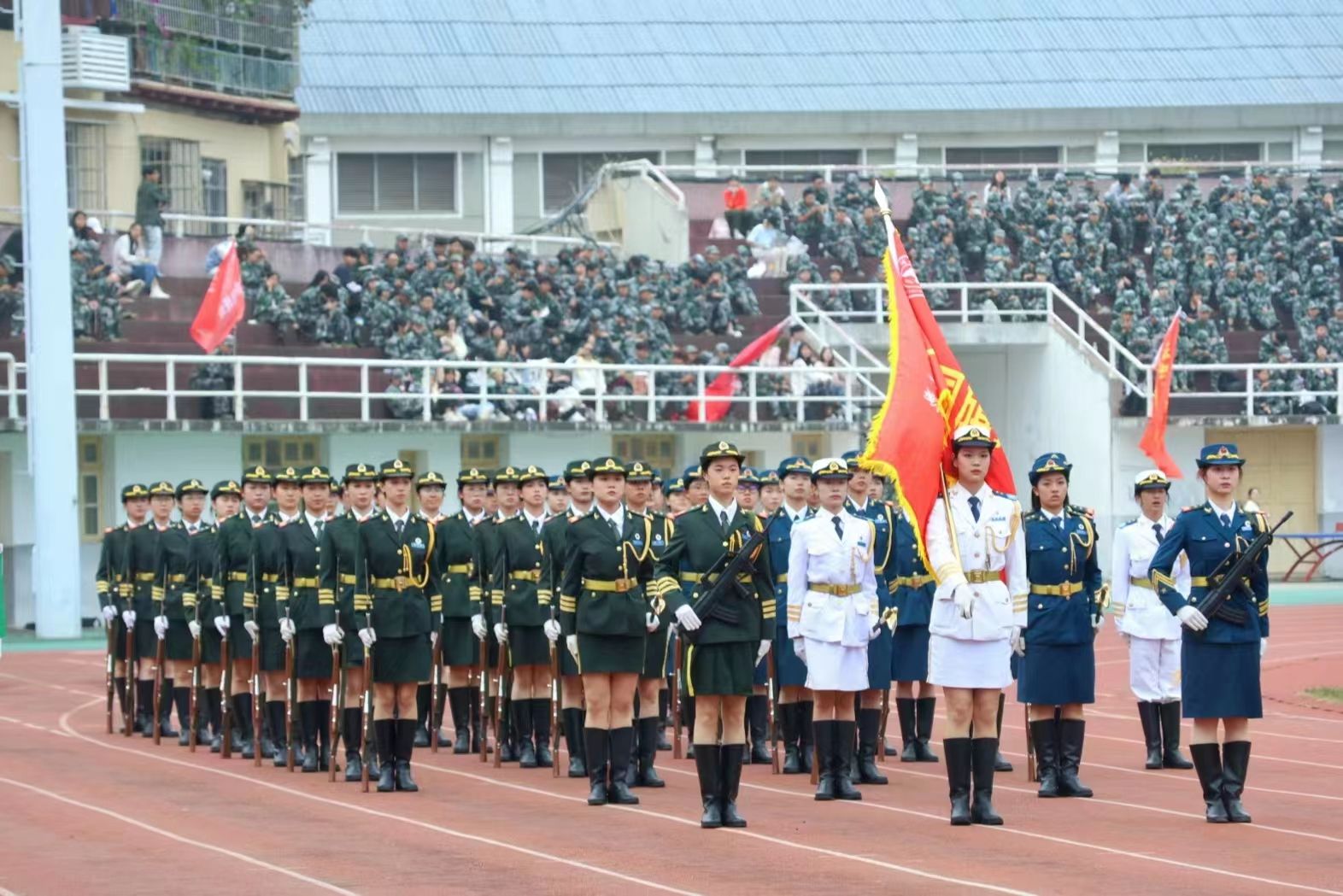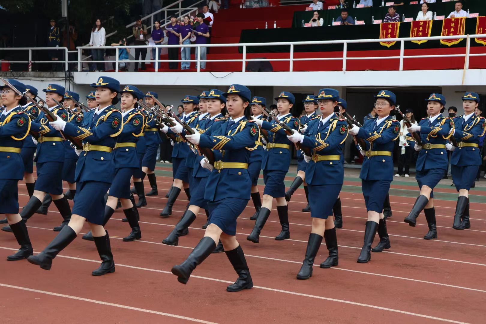 女子国旗护卫队带来枪操表演,不爱红装爱武装,展现出“不让须眉”的巾帼之姿。