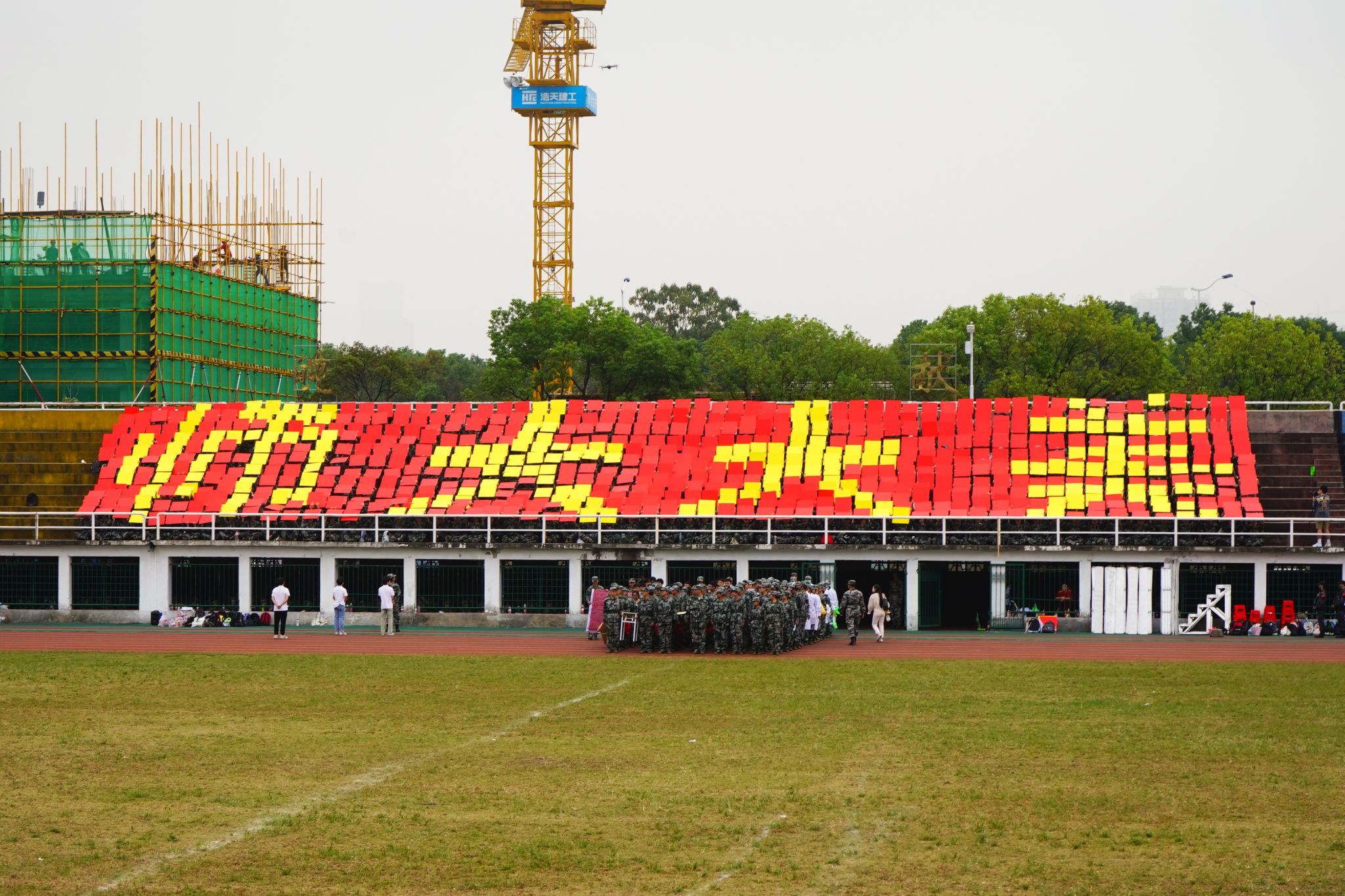 随后进行特色汇报表演。由物理与电子科学学院、体育学院、教育科学学院、美术学院、音乐学院、化学化工学院、生命科学学院、旅游学院共计780名新生组成的翻花方阵蓄势待发,以手中翻腾之花,编排出精彩图文,呈现“强国有我”的辉煌画卷。
