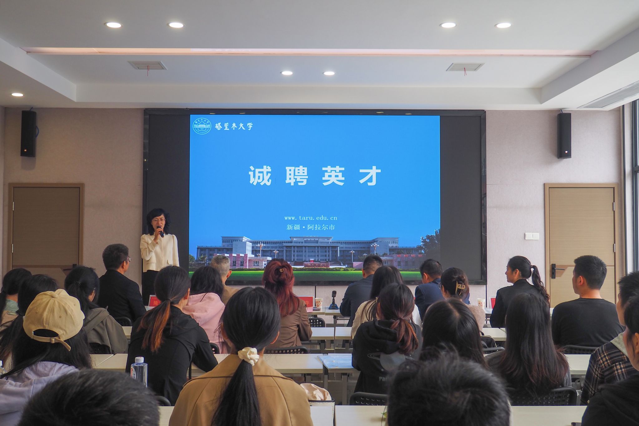 张爱萍对塔里木大学的历史沿革、基础设施、学科建设、人才队伍、教职工待遇等基本情况进行介绍。她表示,塔里木大学是一所出身光荣、环境优美、实力强劲、求贤若渴的大学。这所大学历史悠久、设施完备、发展迅速、学科完善,希望师大学子积极选择塔里木大学,一道为美丽新疆、西部建设贡献自己的力量。她希望通过此次招聘宣讲会,加强两校间的交流合作,共同推进研究生毕业生高质量就业。