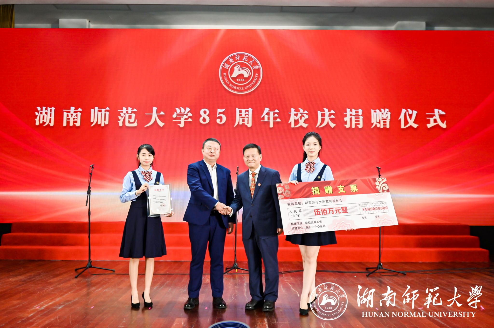 蒋洪新对深圳市博纳教育管理有限公司、山东奥德城投开发有限公司以及衡阳市中心医院的爱心义举表示衷心的感谢,并向捐赠方颁发捐赠证书。他说,近年来,学校积极推进校企校地合作,各项事业成效显著,办学水平大幅提升。在我校85周年校庆之际,深圳博纳、山东奥德以及衡阳市中心医院携手,支持我校建设发展,充分体现了对教育事业的高度重视和远见卓识。学校将努力打造校企医教融合、资源优势共享的协作平台,促进协同发展,实现多方共赢。