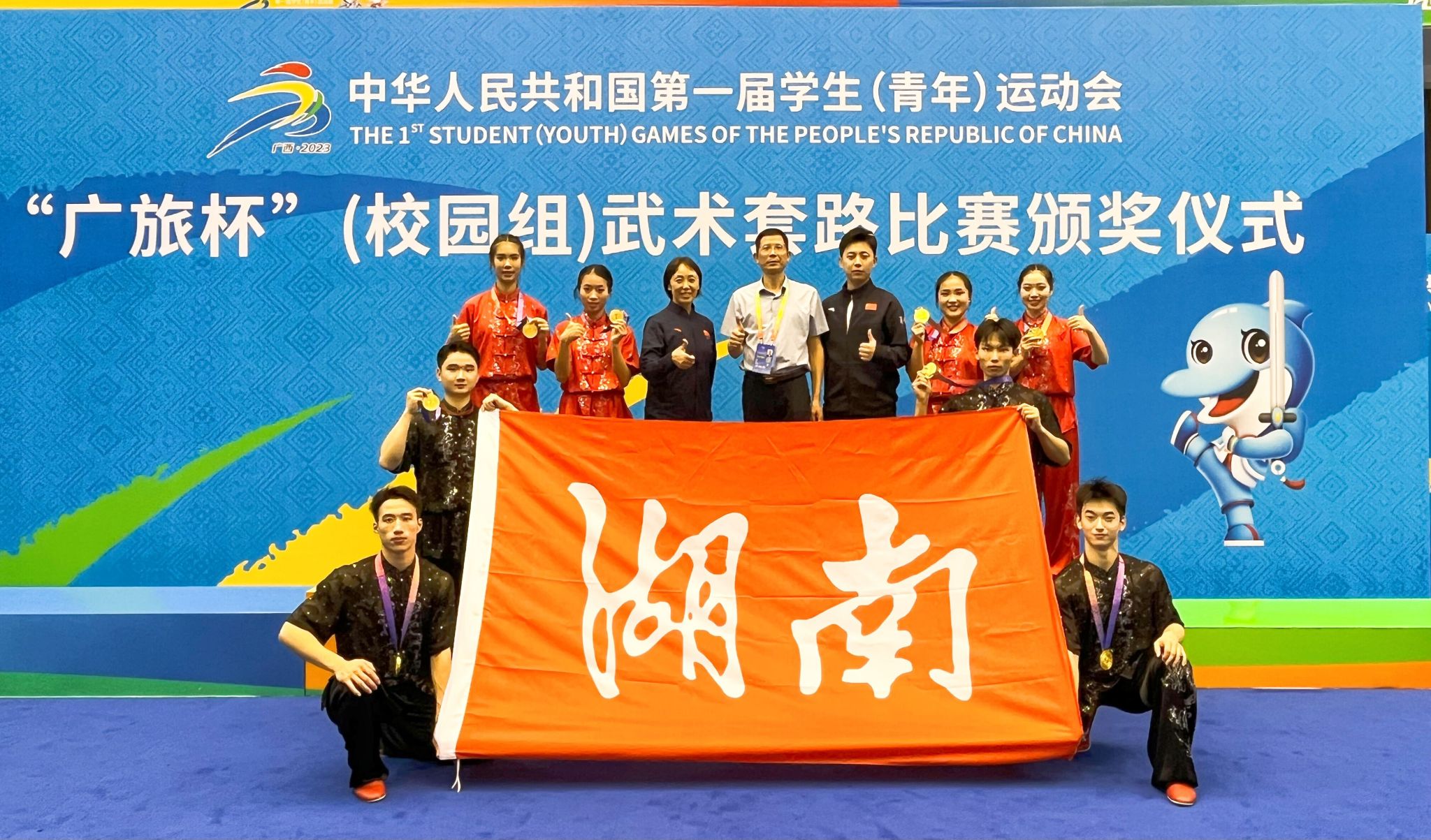 最终,湖南代表队大学组荣获2金1银,1个第四、1个第五、3个第六,1个第八的好成绩,获得团体总分47分,创湖南代表队武术套路大学组历史新高,圆满完成了比赛任务,为湖南代表团争得了荣誉。
