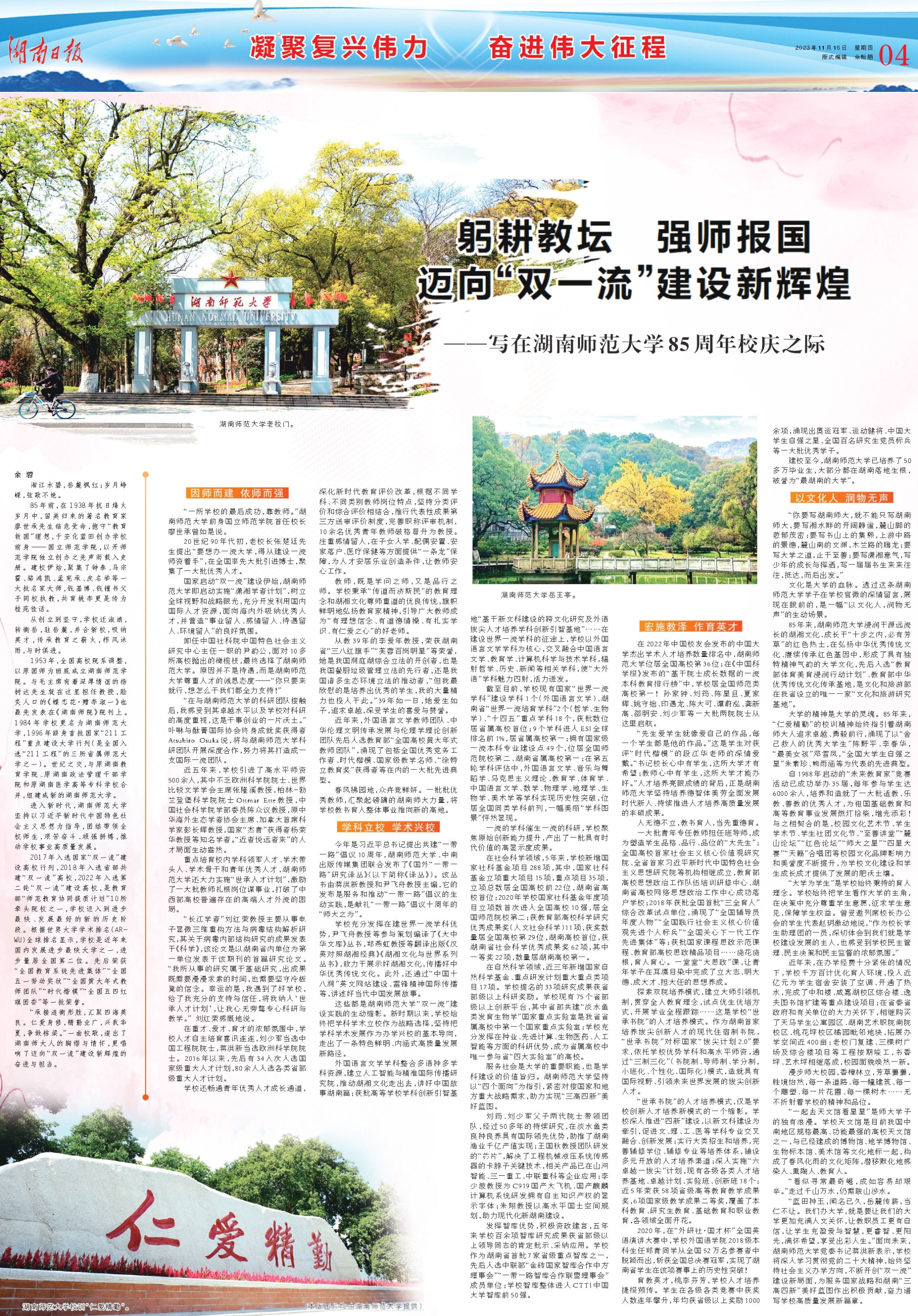 大学的精神是大学的灵魂。85年来,“仁爱精勤”的校训精神始终指引着湖南师大人追求卓越、勇毅前行,涌现了以“舍己救人的优秀大学生”陈野平、李春华,“最美女孩”邓雪凤,“全国大学生自强之星”朱素珍、熊雨涵等为代表的先进典型。