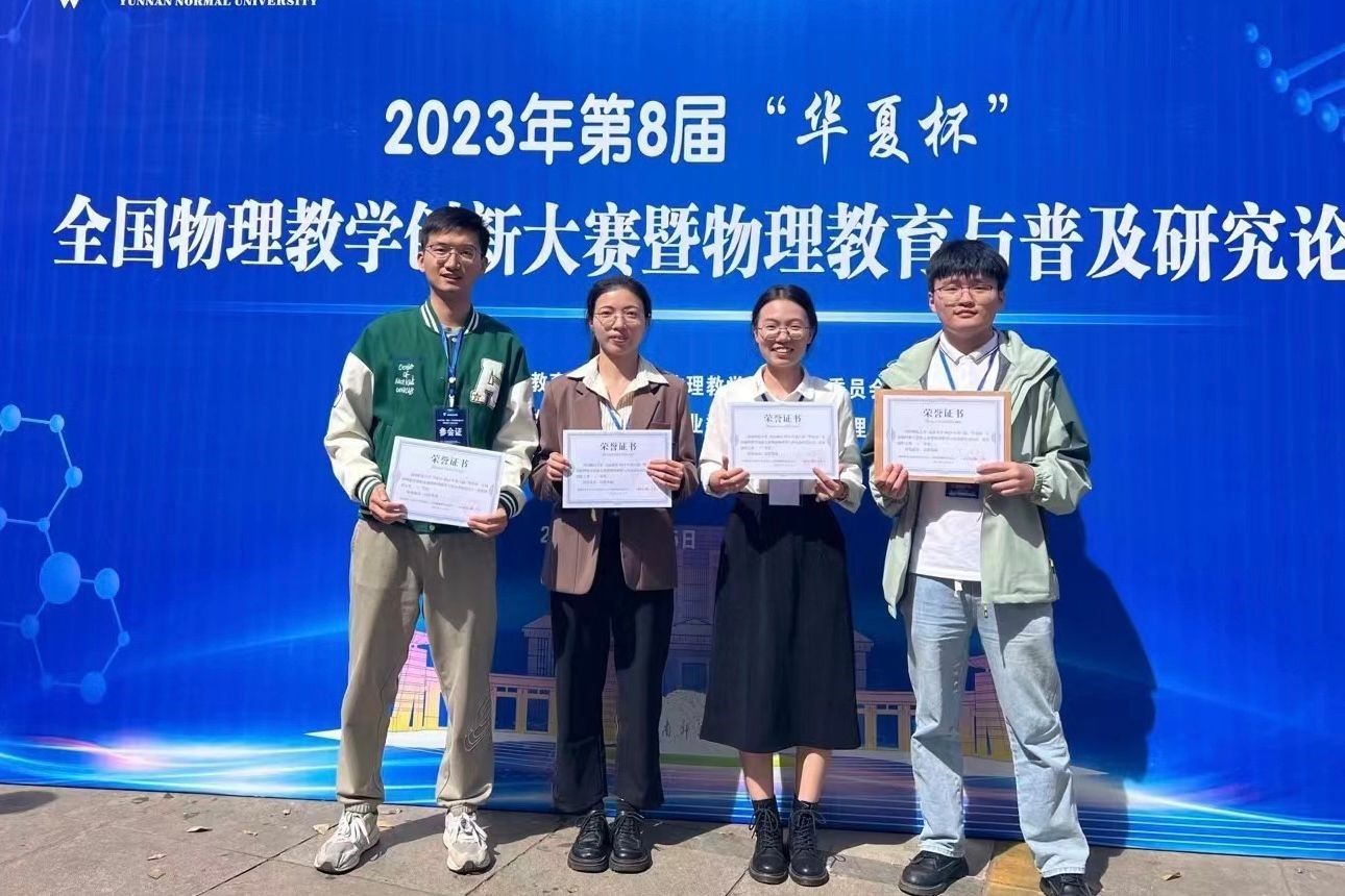(通讯员 寇海龙)11月3日至5日,第八届“华夏杯”全国物理教学创新大赛暨物理教育与普及研究论坛在云南省昆明市举行。我校物理电子与科学学院选派4名优秀研究生代表参加此次比赛,其中,李阳和杨晨雨荣获一等奖;吴垚燚和寇海龙荣获二等奖。我校获得优秀组织奖。