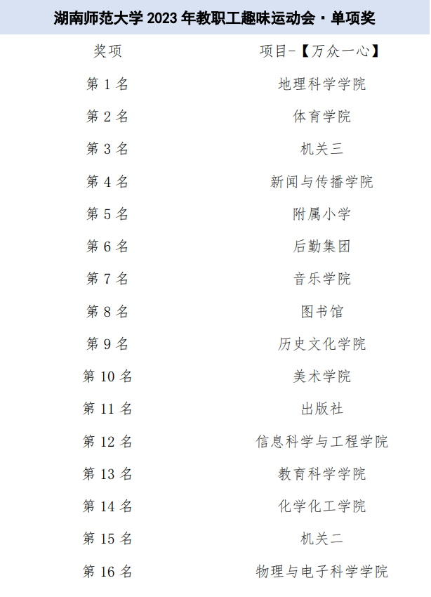本次活动吸引了30个部门工会代表队千余名教职工踊跃参赛。比赛四个项目设单项奖1-16名,团体奖1-8名。经过激烈角逐,体育学院赢得“携手并进”项目的胜利;图书馆取得“趣味飞盘”的第一名;地理科学学院摘得“万众一心”的桂冠;教育科学学院获得“快乐一起拼”的冠军。图书馆、附属小学、机关三、教育科学学院、出版社、化学化工学院、树达学院、后勤集团获团体奖。