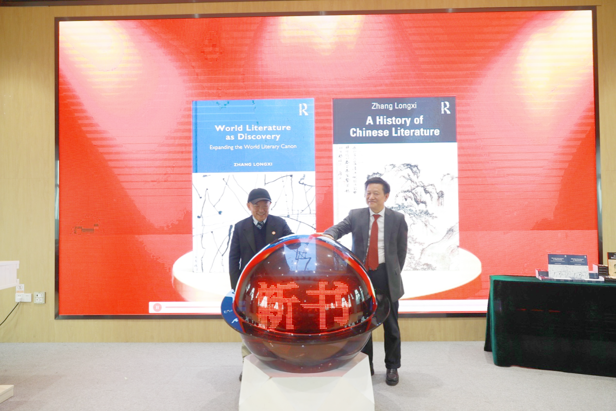 与会专家学者共同见证张隆溪先生新书发布,蒋洪新、张隆溪共同为新书揭幕。