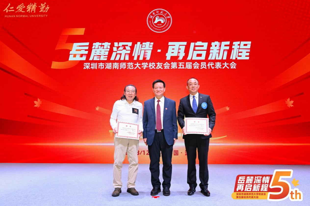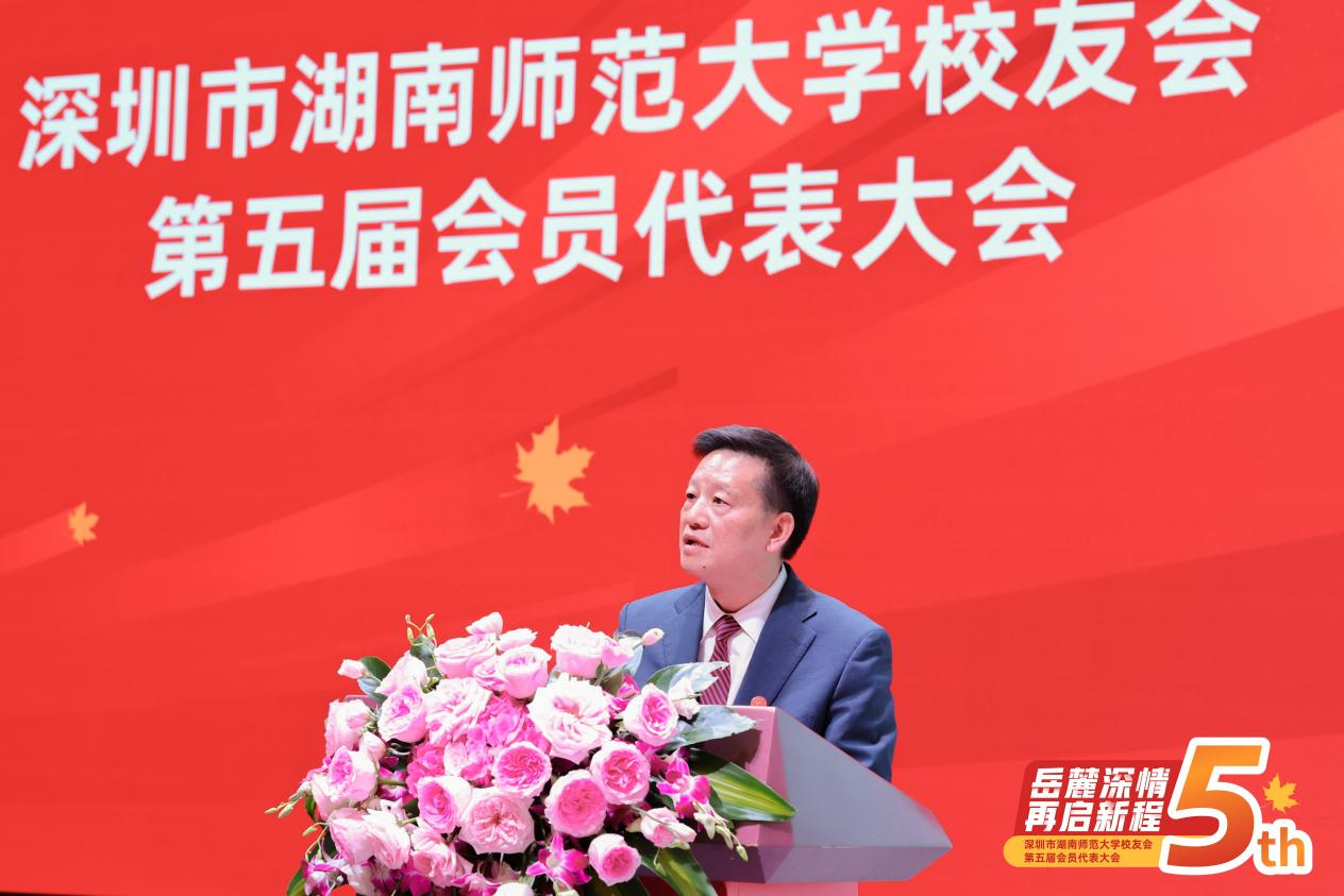 蒋洪新在代表大会上发表讲话。他对深圳校友会第五届会员大会的顺利召开表示祝贺,向与会嘉宾表示热烈欢迎和亲切问候。他简要介绍了学校近年来在学科建设、人才引进、基础设施建设方面取得的成绩,强调了集合校友、政府、社会等各方力量,构建命运发展共同体的重要性。蒋洪新希望,深圳校友会能以“共叙同窗友情,传播师大品牌,整合校友资源,服务深圳建设”为宗旨,成为校友们传递母校情感的重要载体、互促共进的发展平台、联络感情的精神家园。最后,他即兴填词《贺新郎·为深圳校友会第五届会员大会而作》,表达谢忱、以示激励。