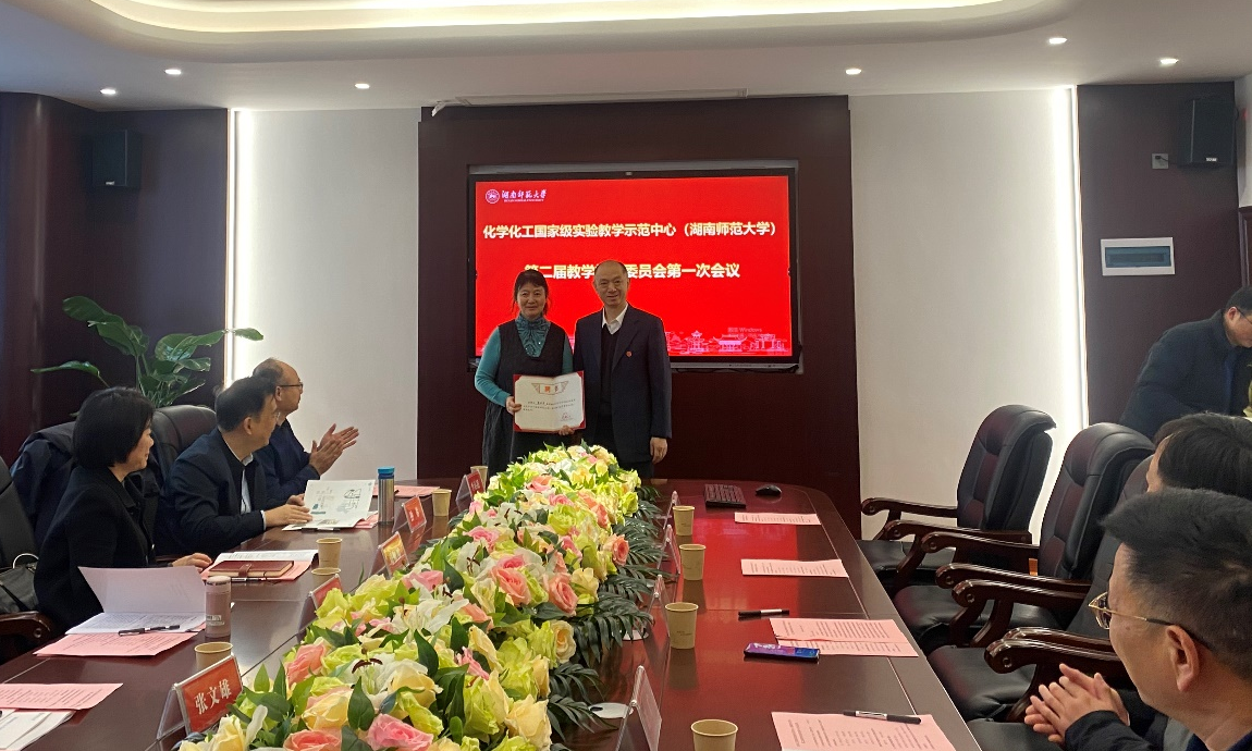 杨震对参会的各位委员和专家表示热烈的欢迎。他简要介绍了我校和化学化工学院的基本情况。他指出,在第一届教指委的关心、支持和指导下,示范中心在师资队伍建设、实验教学改革与研究、课程建设、本科生学科竞赛、本科生创新创业教育等方面取得了较好的成果。他希望,在第二届教学指导委员会的有力指导下,示范中心各项工作再上一个台阶。他宣读了示范中心第二届教学指导委员会委员名单并为受聘专家颁发聘书。