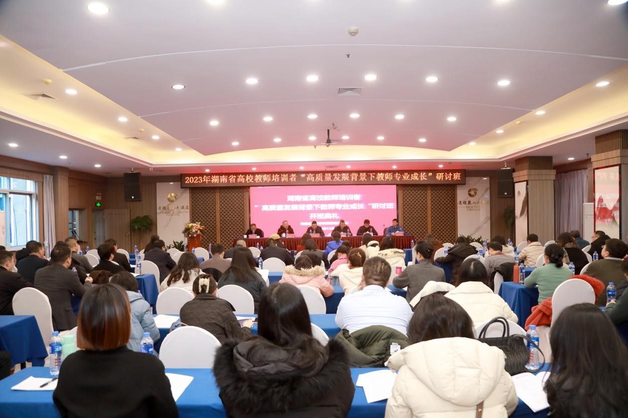 (供稿 高师培训中心)近日,由湖南省教育厅主办、我校高等学校师资培训中心承办的2023年湖南省高校教师培训者“高质量发展背景下教师专业成长”高级研讨班顺利开班。湖南省教育工委委员、教育厅党组成员、总督学郭建国,我校副校长蒋新苗出席活动。开班仪式由我校高等师资培训中心常务副主任彭运石主持。